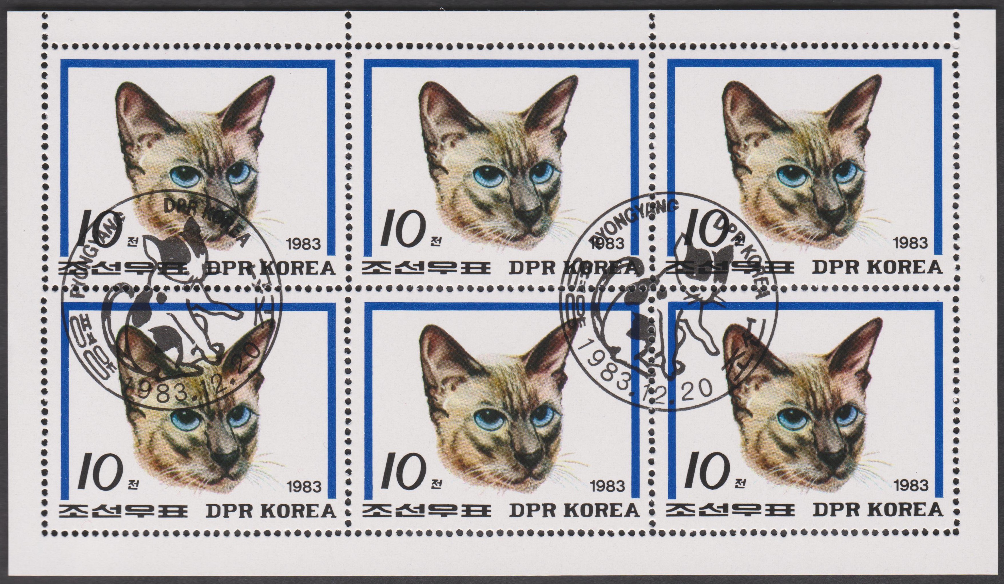 Nordkorea MiNr. 2432 zeigt einen Katzenkopf, hier im 3x2 Kleinbogen mit Ersttagssonderstempel: