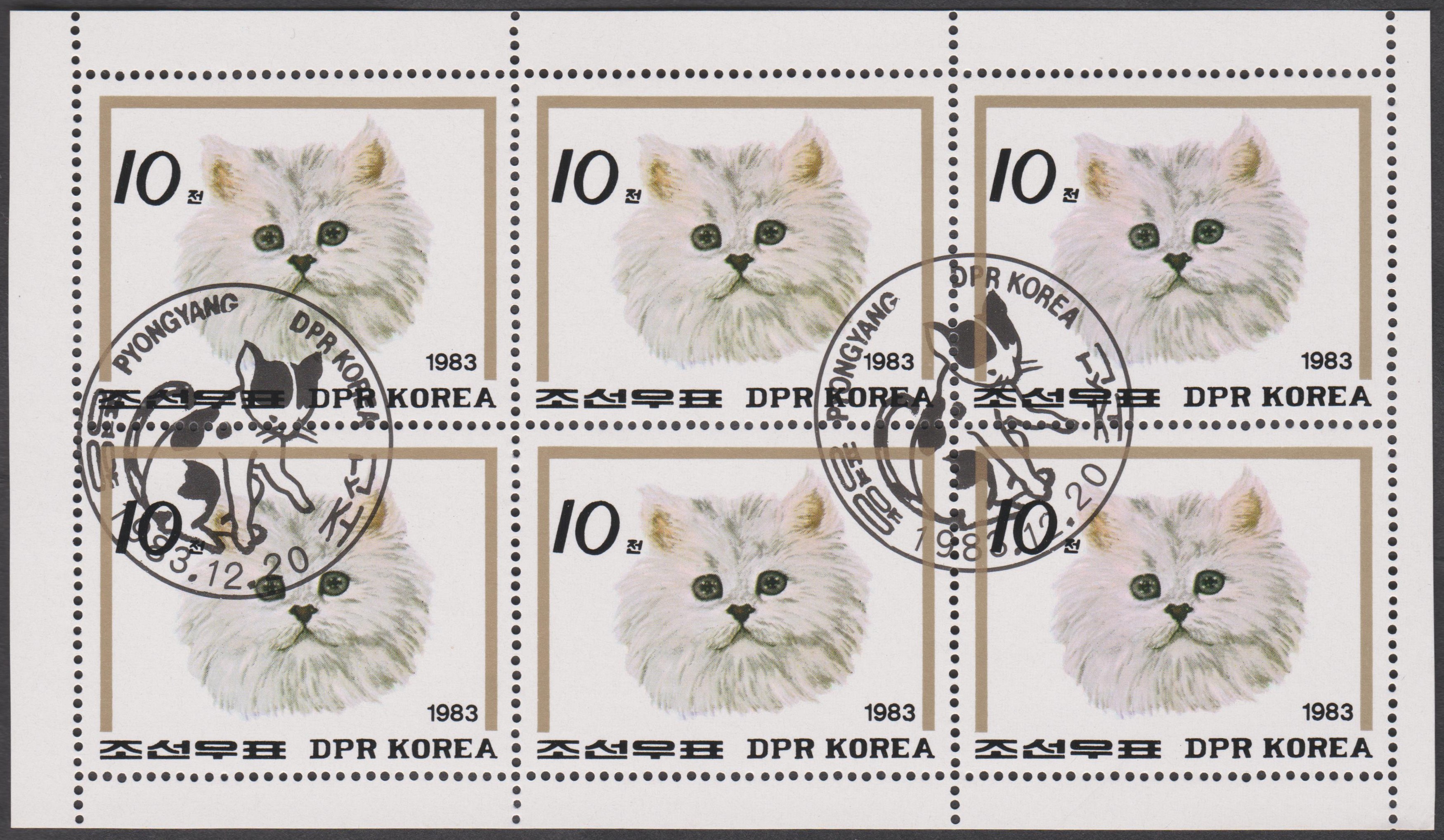 Nordkorea MiNr. 2435 zeigt einen Katzenkopf, hier im 3x2 Kleinbogen mit Ersttagssonderstempel: