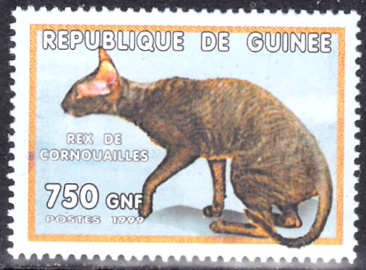 Cornish Rex ist eine Hauskatzen-Rasse. Ihr markantestes Merkmal ist das gekräuselte Fell. Die erste Katze dieser Rasse tauchte Anfang der 50er Jahre in Cornwall auf. Auf dieser Marke aus Guinea (MiNr 2483) ist eine Cornish Rex zu sehen.