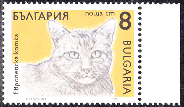 In einer anderen Serie mit Katzenmotiven erschien in Bulgarien diese Marke (MiNr 1717) mit einer Europäischen Katze.
