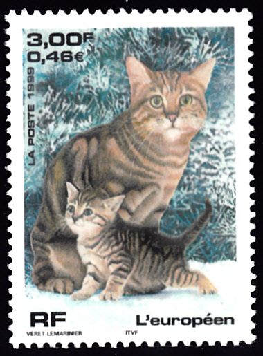 Aus Frankreich kommt diese Marke (MiNr 3425) mit der Abbildung einer Europäischen Kurzhaarkatzenmutter mit ihrem Katztenkind.