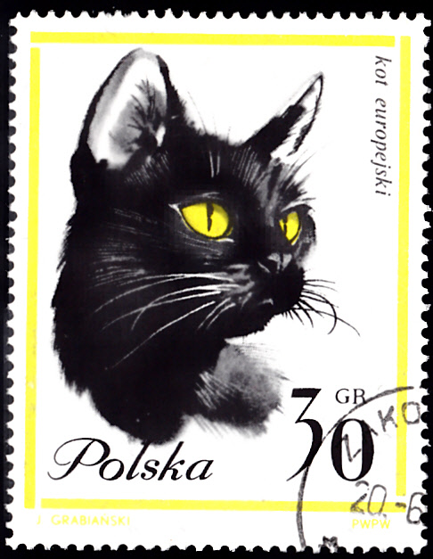 In einer Serie "Katzen" ist in Polen auch diese Marke (MiNr 1475) mit dem Kopf einer schwarzen Europäischen Katze erschienen.