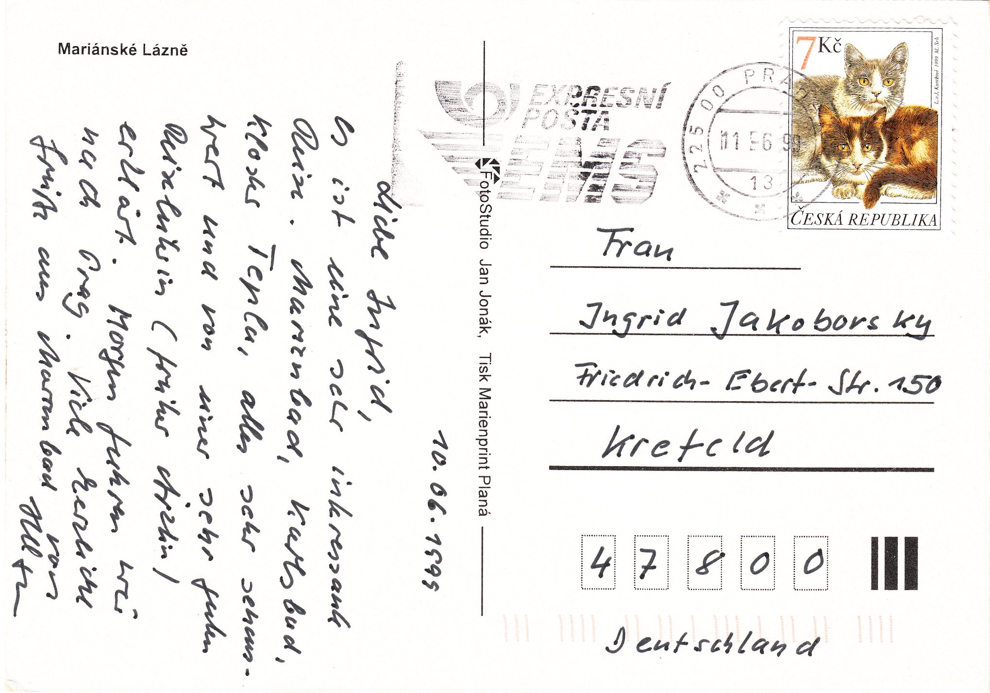 Hier als Beispiel eine Katzenmutti mit ihrem Jungen auf einem Postwertzeichen aus Tschechien aus dem Jahr 1999: