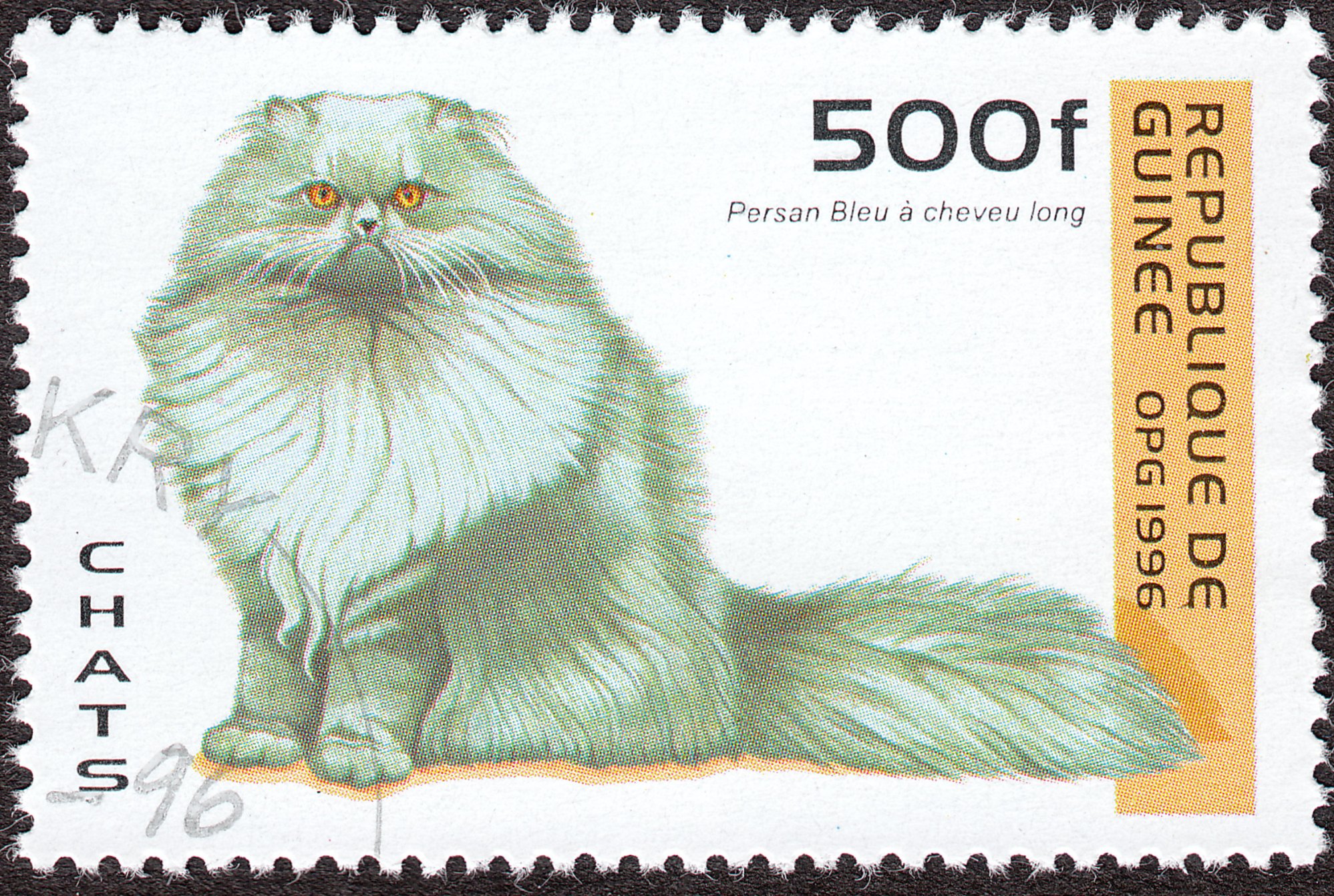 Hier eine blaue Langhaar-Perserkatze auf einer Marke aus Guinea: