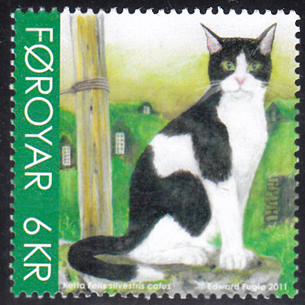 Hier eine Marke aus Dänemark Färöer (MiNr 715) mit einer schwarzweißen Hauskatze.