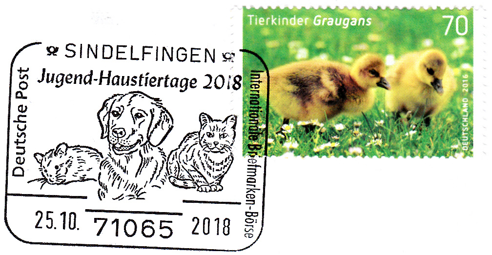 Zu den Jugend-Haustiertage bei der Briefmarken-Börse Sindelfingen wurde am 25.10.2018 ein Sonderstempel eingesetzt, der auch eine Hauskatze zeigt.