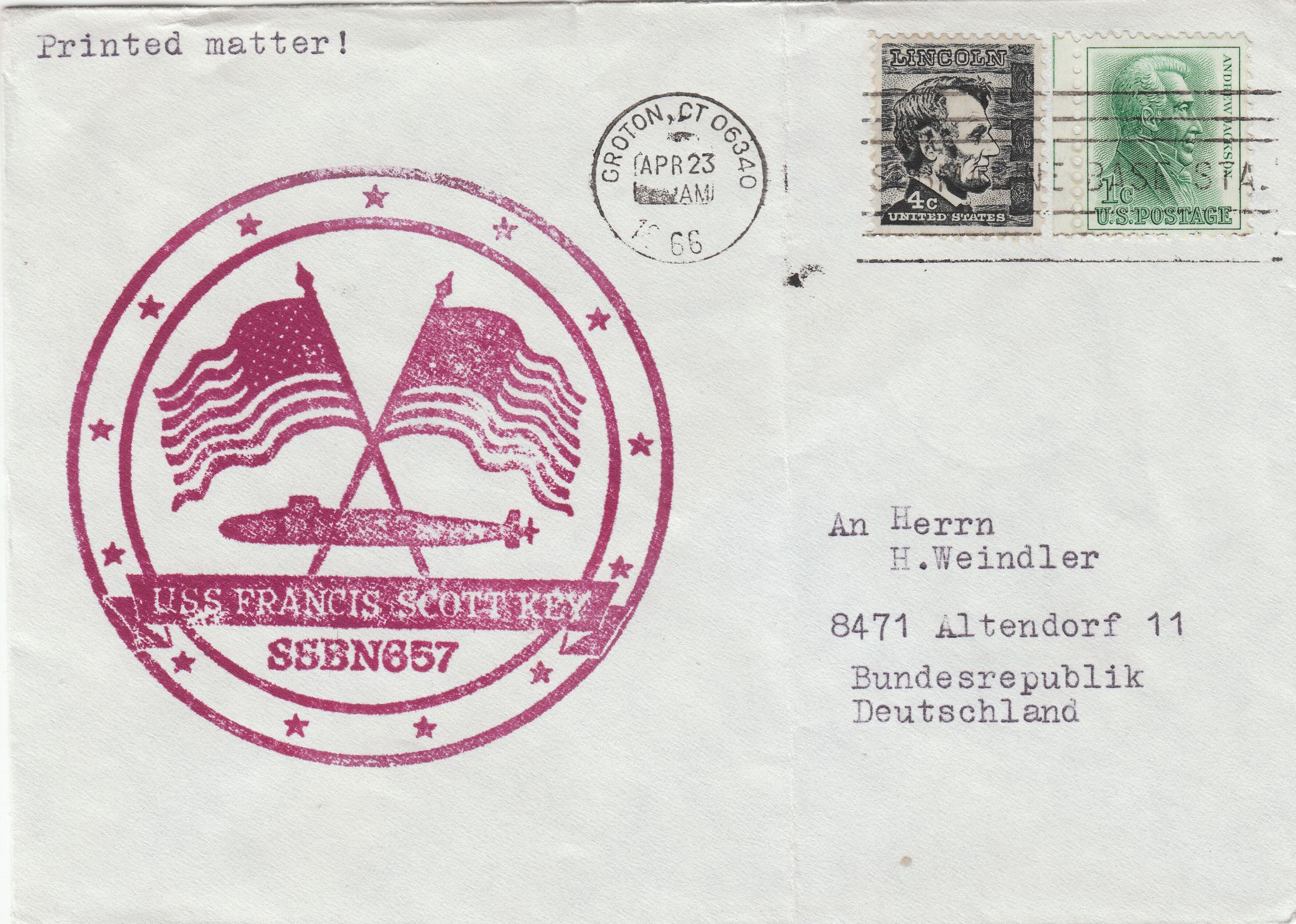 Dieser Beleg vom 23.04.1966 stammt aus der Zeit zwischen dem Stapellauf am 23.04.1965 und der Indienststellung am 03.12.1966, als das Boot in Croton ausgerüstet wurde: