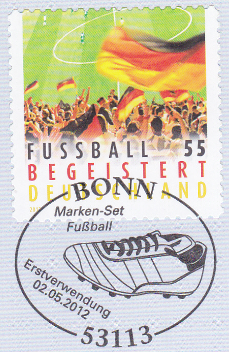 Diese Marke der Deutschen Post (MiNr 2930) "Fußball begeistert Deutschland" ist mit dem Ersttagsonderstempel Bonn gestempelt.