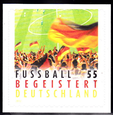 Die im Jahre 2012 erschienene Marke "Fußball begeistert Deutschland" (MiNr 2930) zeigt Anhänger der deutschen Fußball-Nationalmannschaft beim "Public Viewing".