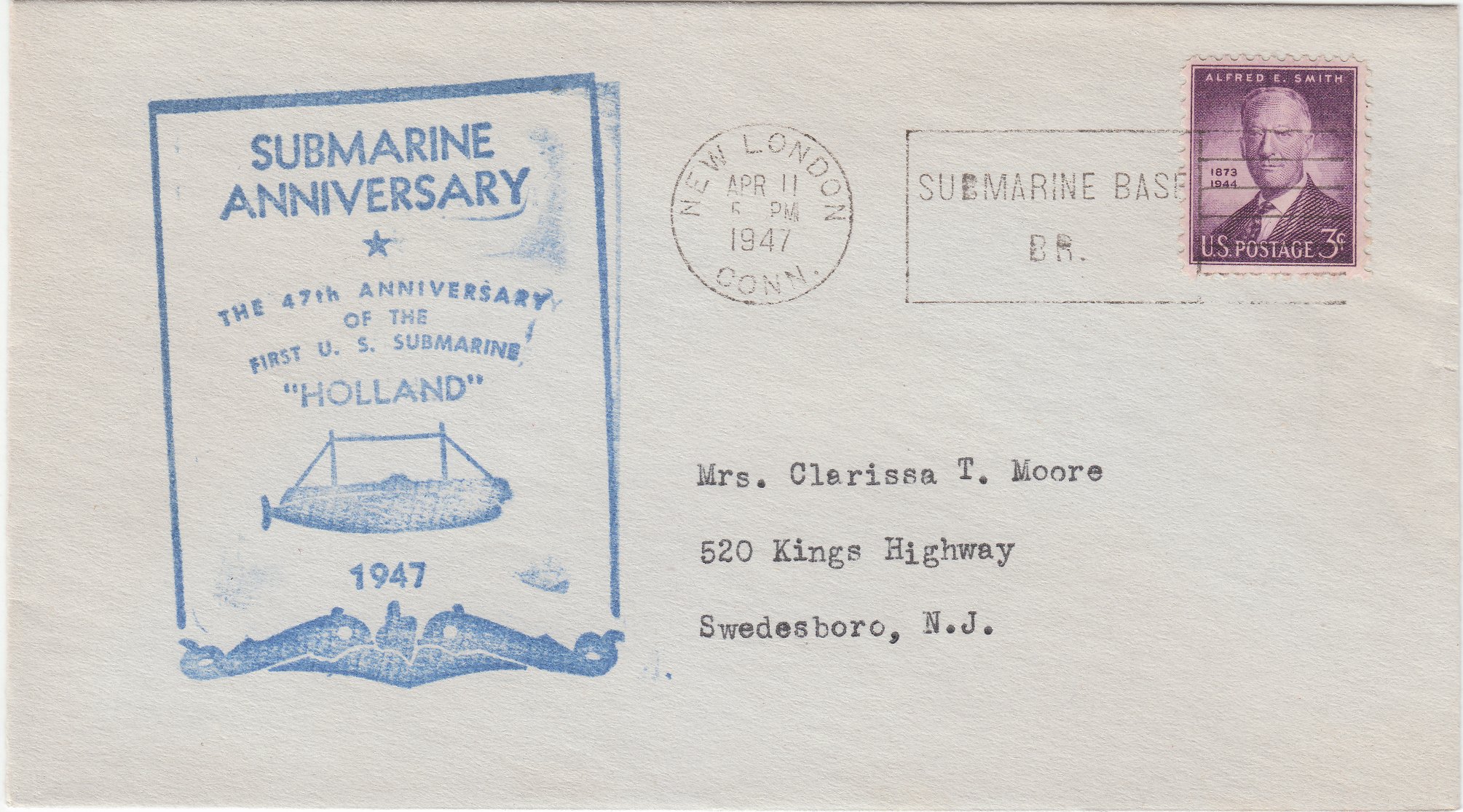 Dieser Beleg dokumentiert am 11.04.1947 durch einen eigens angefertigten Cachetstempel in Blau den 47.Jahrestag des Kaufes der USS HOLLAND (SS-1) am 11.04.1900: