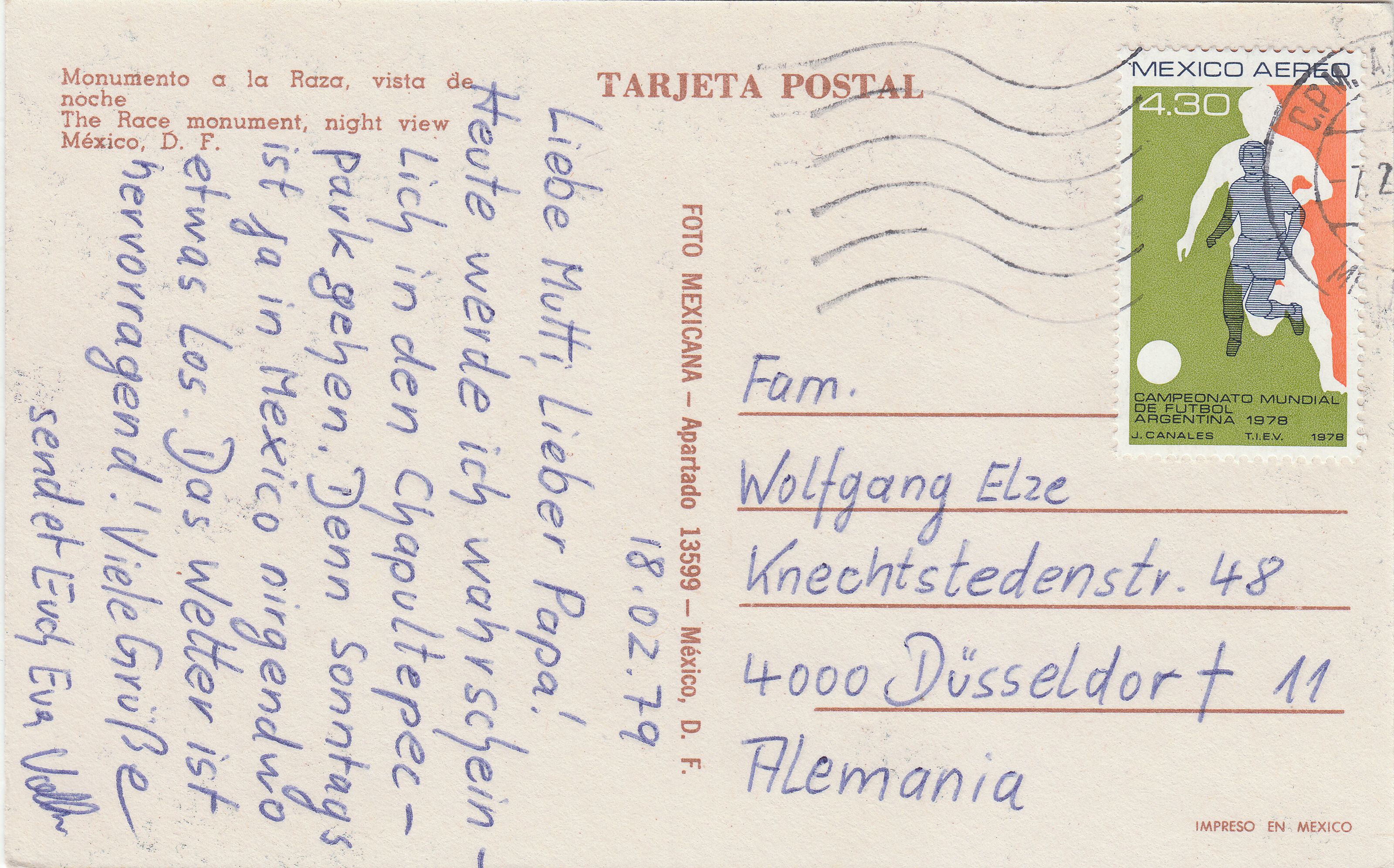 Aus Mexico zeige ich Euch hier eine Sondermarke zur Fussball-WM 1978 in Argentinien in Form einer Einzelfrankatur auf einer Postkarte nach Deutschland:
