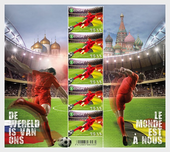 Zur Fußball-WM 2018 ist Belgien eine Marke (MiNr 4825) mit einem Fußballer beim Schuss und der belgischen Flagge. Der Nominalwert der Marke betrug zur Zeit der Ausgabe 1.36 €. Die Marke ist im Kleinbogen mit fünf Marken erschienen.
