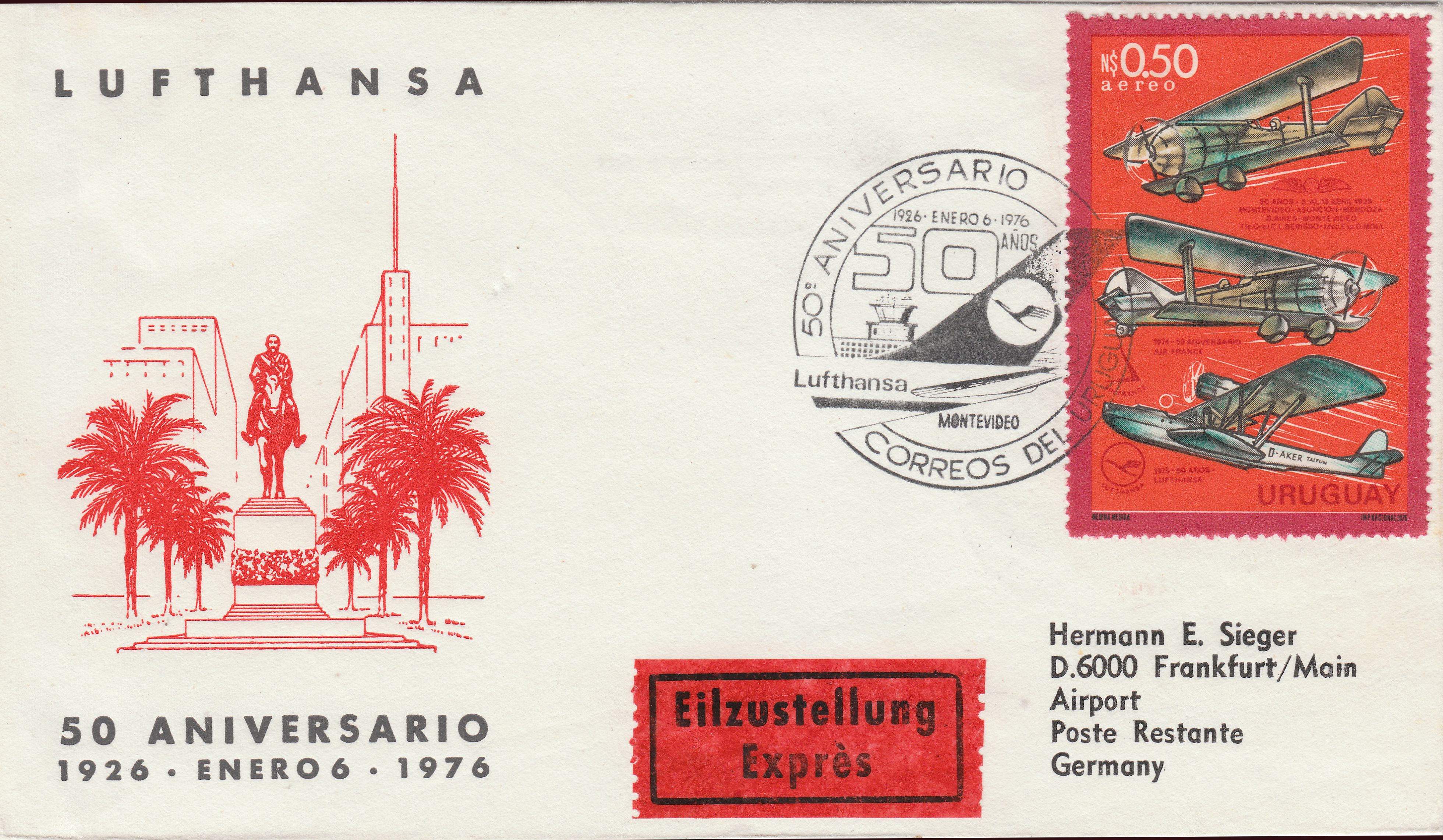 Zum Achtelfinale zeige ich Euch aus Uruguay hier eine EF zum Thema "50 Jahre Lufthansa", die von der Firma Sieger "produziert" wurde: