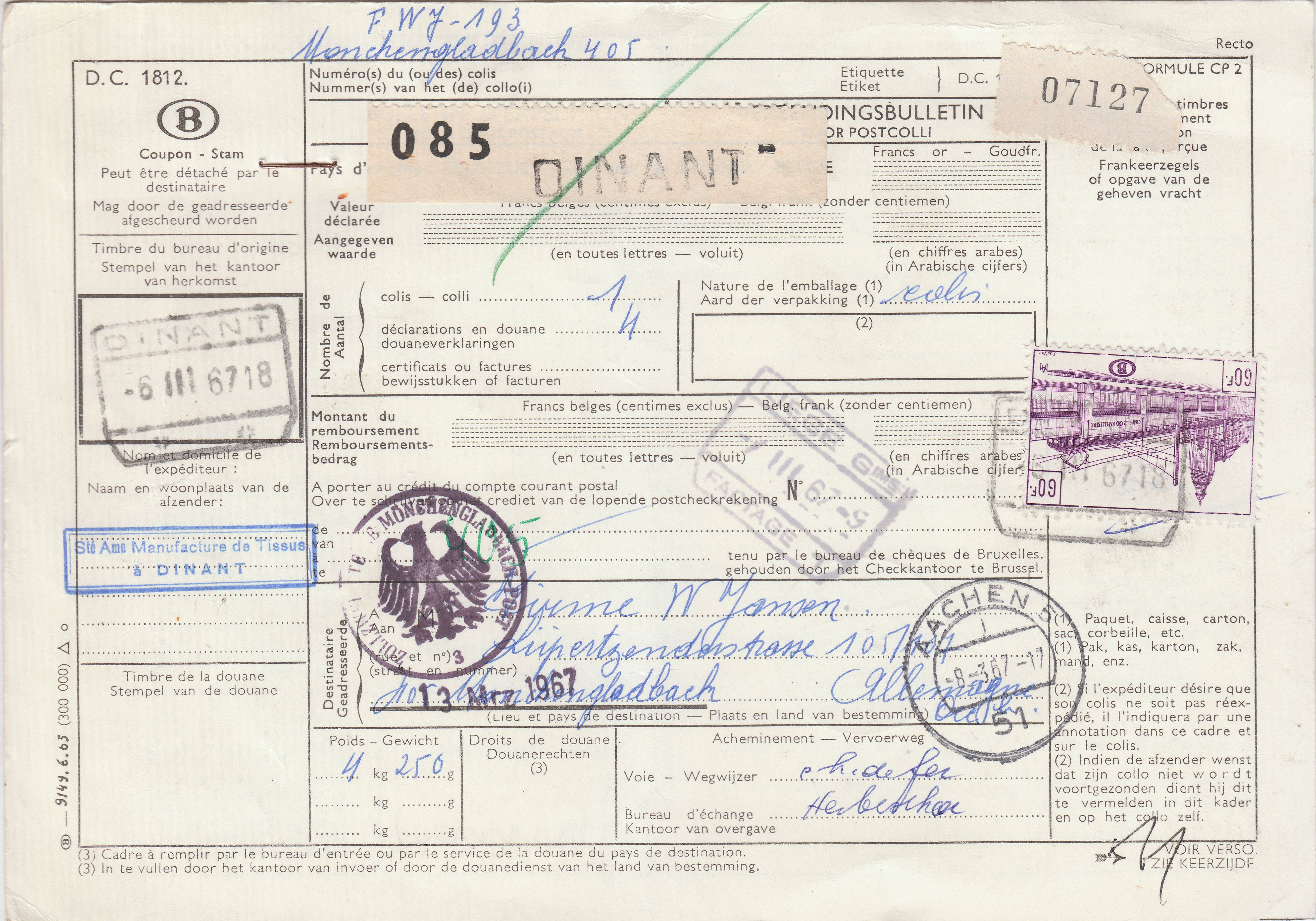 Das Paket wurde am 06.03.1967 in DINANT aufgegeben und lief am 07.03.1967 über Liege = Lüttich und am 08.03.1967 AACHEN nach MÖNCHENGLADBACH, wo es am 10.03.1967 ankam. Nach Prüfung durch die "ZOLLZWEIGSTELLE MÖNCHENGLADBACH" am 13.03.1967 durfte es dem Empfänger zugestellt werden.
