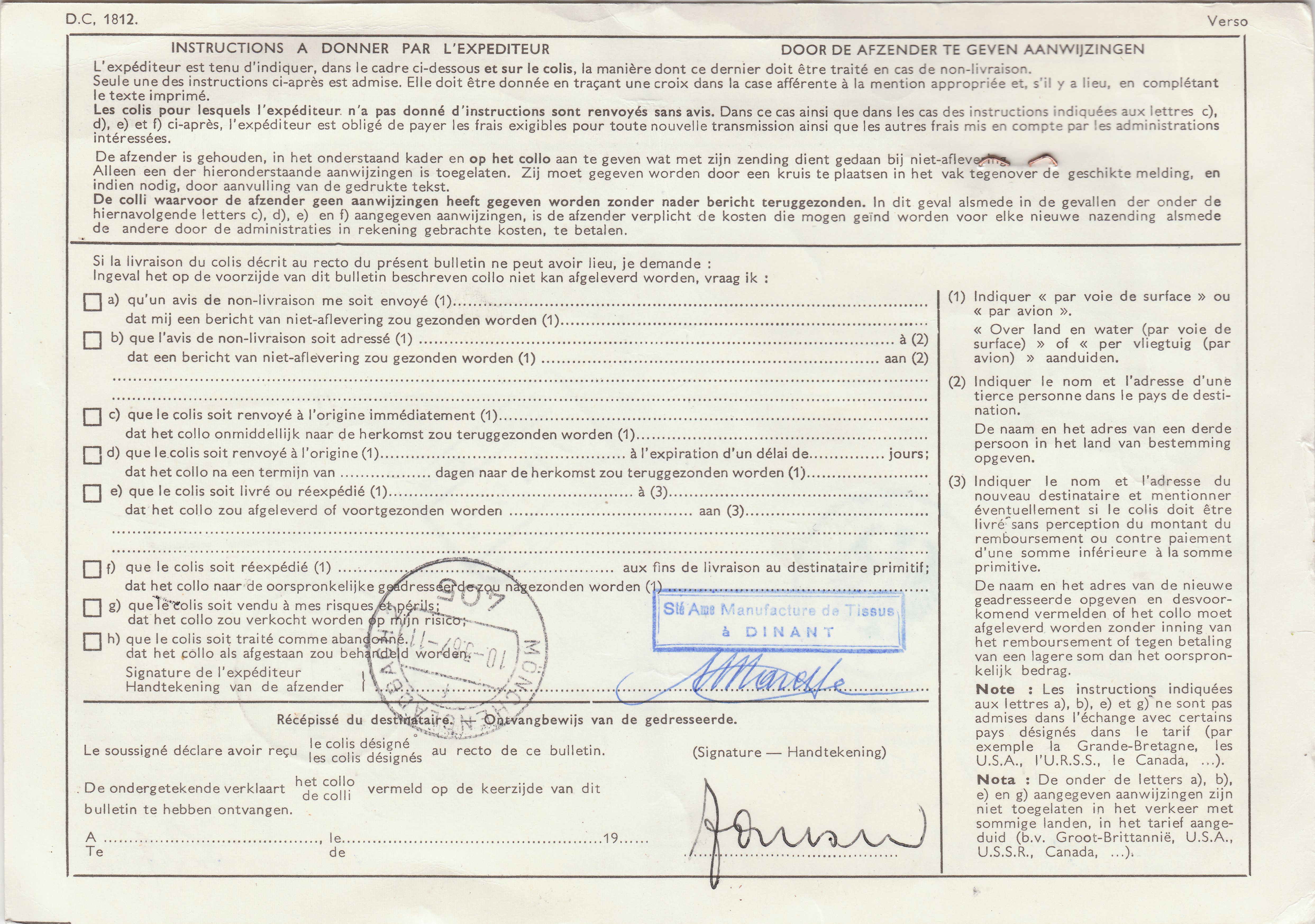 Das Paket wurde am 06.03.1967 in DINANT aufgegeben und lief am 07.03.1967 über Liege = Lüttich und am 08.03.1967 AACHEN nach MÖNCHENGLADBACH, wo es am 10.03.1967 ankam. Nach Prüfung durch die "ZOLLZWEIGSTELLE MÖNCHENGLADBACH" am 13.03.1967 durfte es dem Empfänger zugestellt werden.