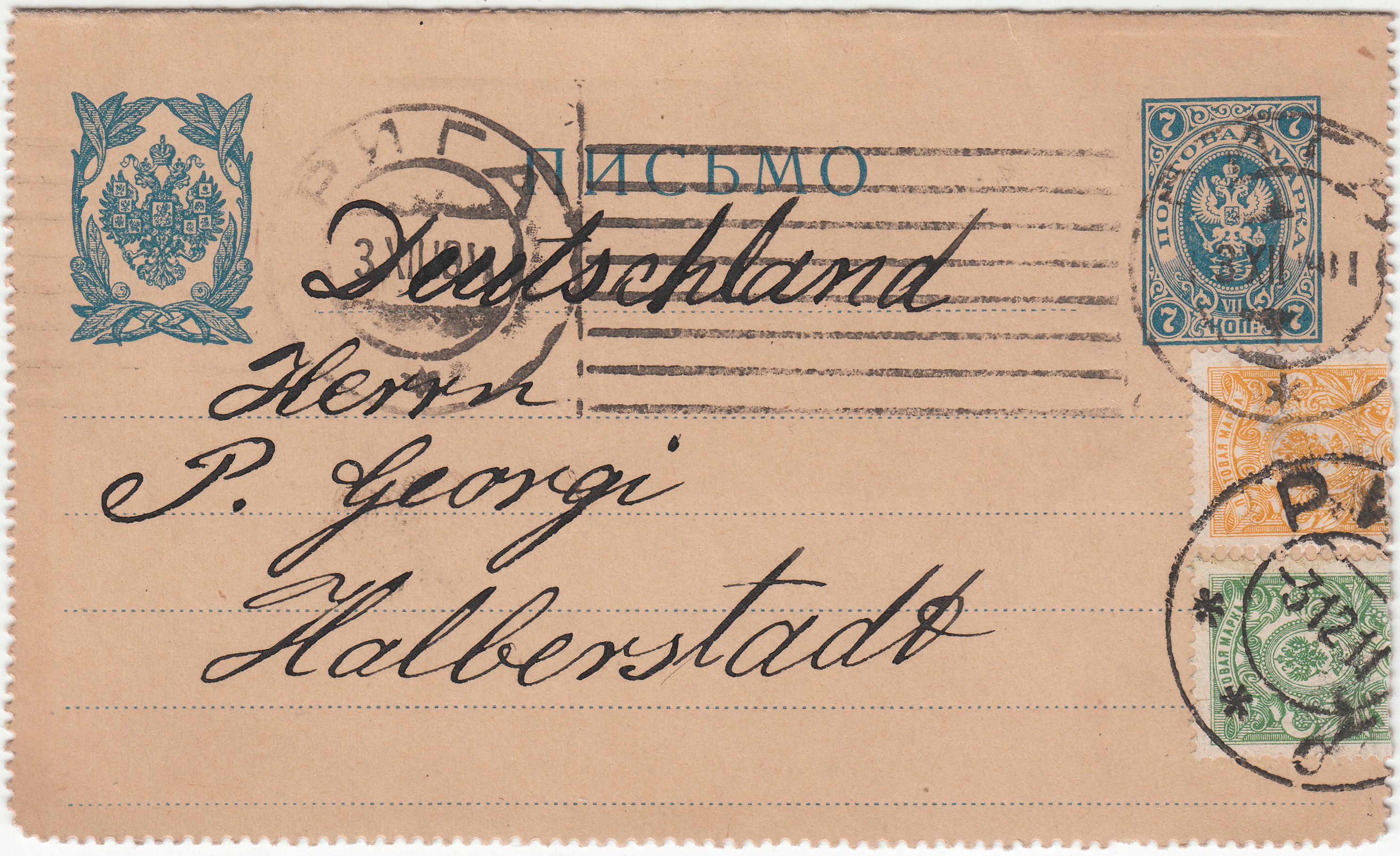 Aus Russland zeige ich Euch zum Viertelfinale diesen Kartenbrief mit Zusatzfrankatur, adressiert nach Halberstadt: