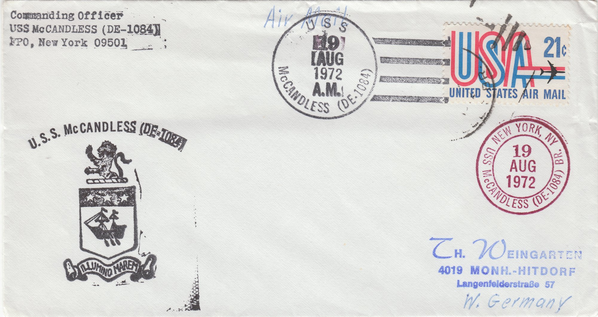 Dieser Beleg vom 19.08.1972 zeigt sowohl den Bordstempel des Schiffes In Schwarz als auch den Hafenstempel des Schiffes in Rotlila mit der Kennung DE-1084: