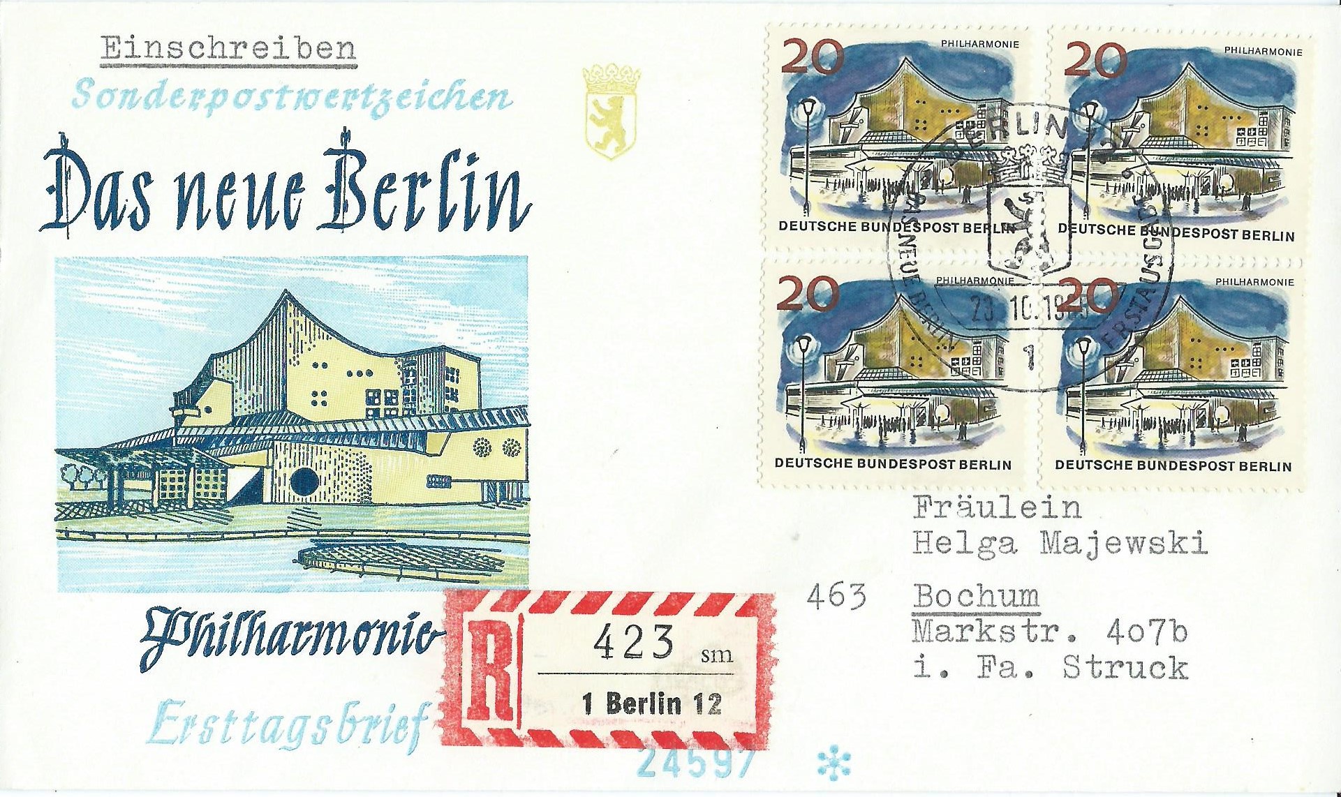 zu der Berlin-Sondermarkenserie „Das neue Berlin“ (Michel-Nummer 254 – 265) kann ich einige Ersttagsbriefe zeigen. Sie sind alle adressiert und scheinbar auch gelaufen, wobei die Portorichtigkeit doch so manches Mal stark zu wünschen übrig lässt. Aber wie schon an anderer Stelle erwähnt, alle solche Belege zählen als Ersttagsbrief, egal was an Frankaturhöhe draufklebt, solange sie am Erstausgabetag gestempelt wurden.
