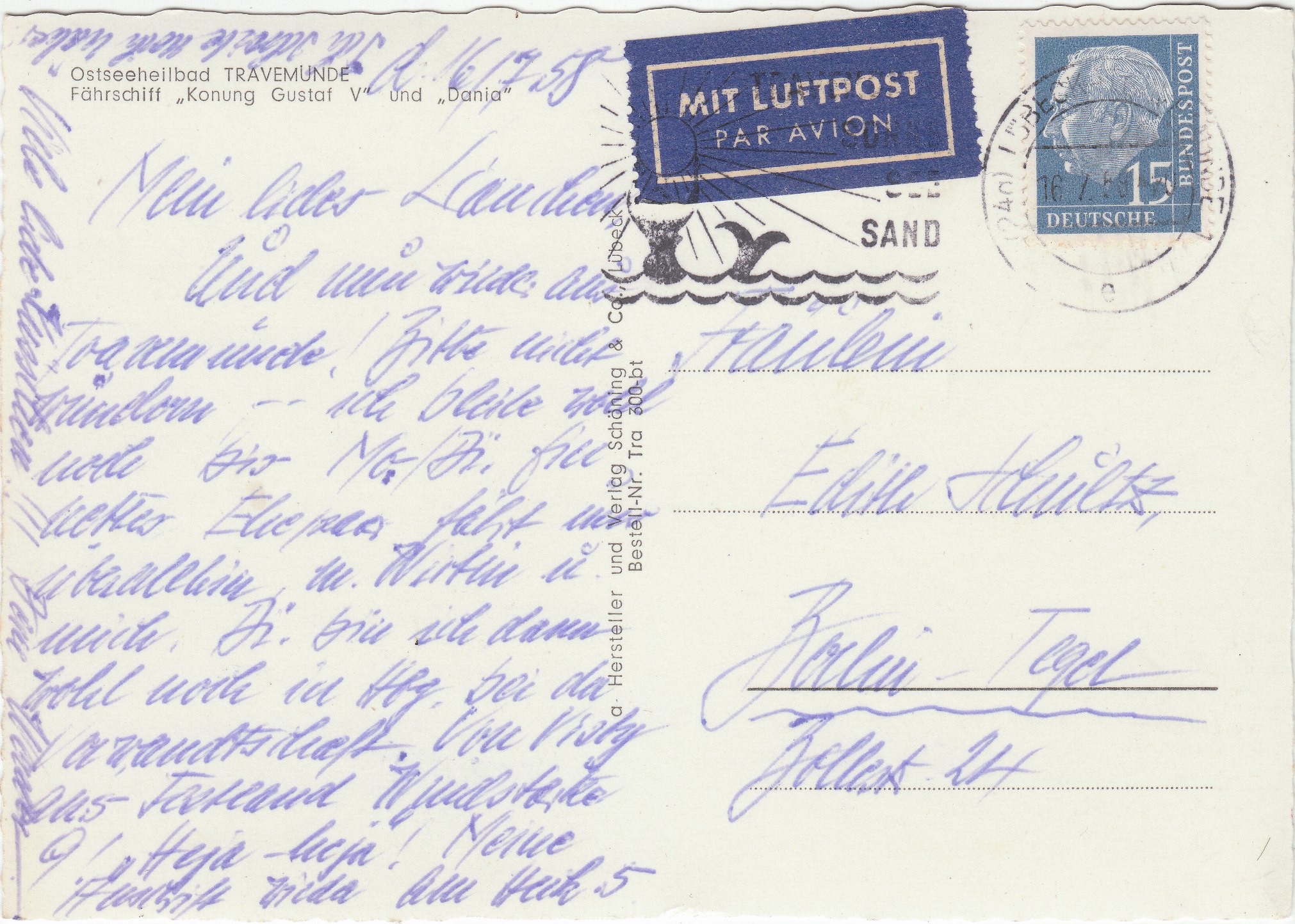Diese Postkarte im Fernverkehr (10 Pf) per Luftpost (5 Pf), portogerecht frankiert per EF mit 15 Pf Heuss wurde am 16.07.1958 in Lübeck-Travemünde aufgegeben und dokumentiert somit die Flugstrecke Hamburg-Berlin: