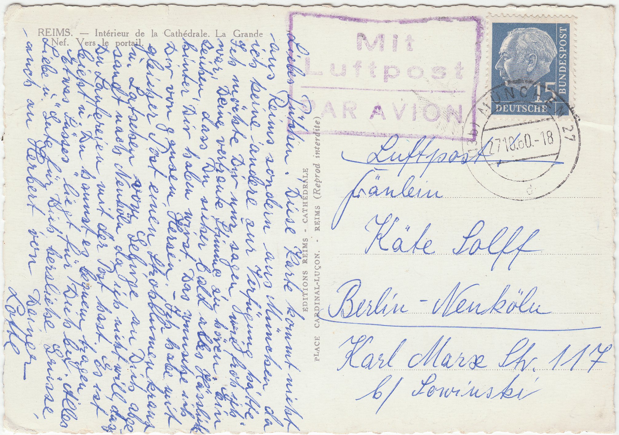 Diese Postkarte im Fernverkehr (10 Pf) per Luftpost (5 Pf), portogerecht frankiert per EF mit 15 Pf Heuss wurde am 27.10.1960 in München aufgegeben und dokumentiert somit die Flugstrecke München-Berlin: