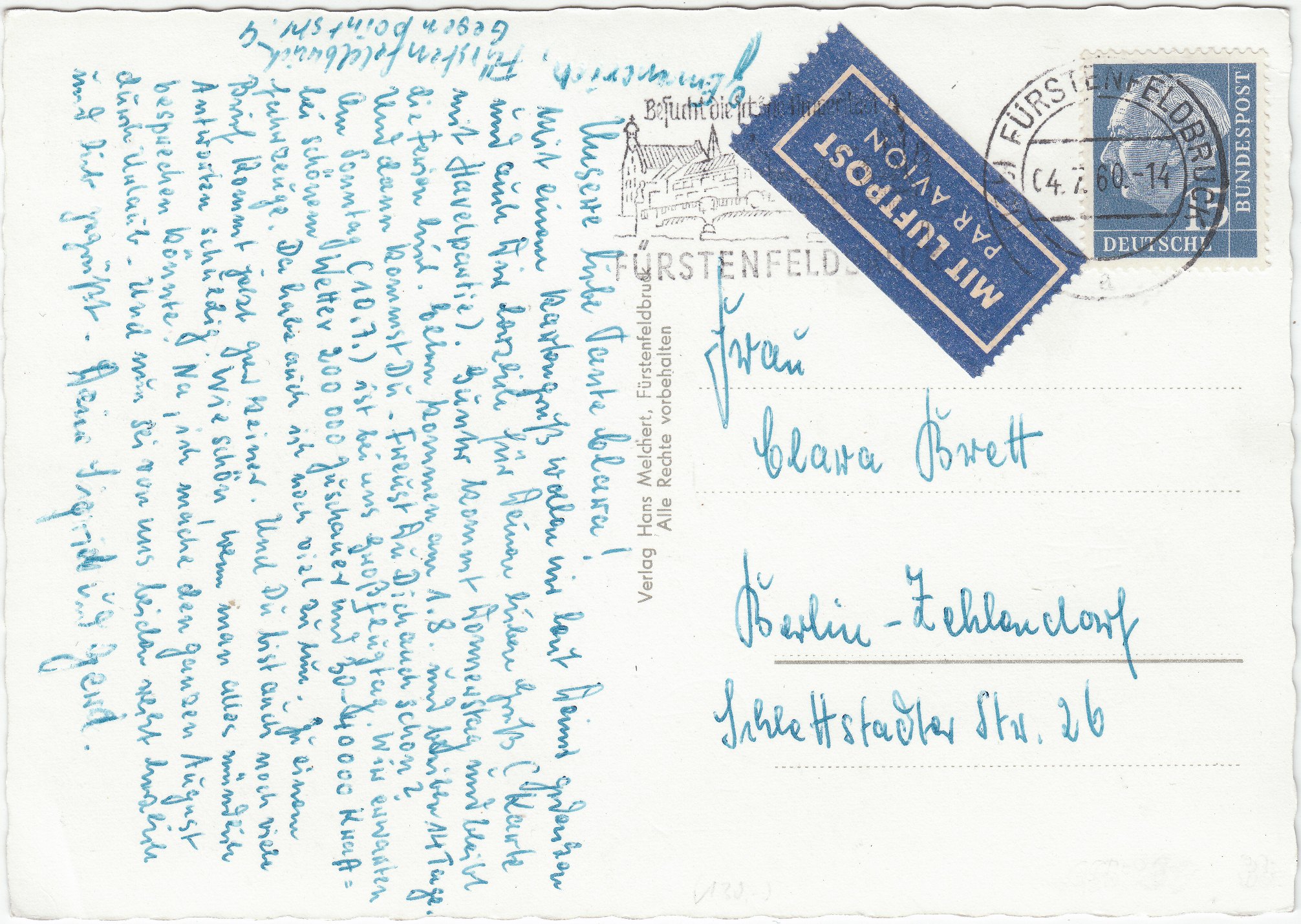 Diese Postkarte im Fernverkehr (10 Pf) per Luftpost (5 Pf), portogerecht frankiert per EF mit 15 Pf Heuss wurde am 04.07.1960 in Fürstenfeldbruck aufgegeben und dokumentiert somit die Flugstrecke München-Berlin: