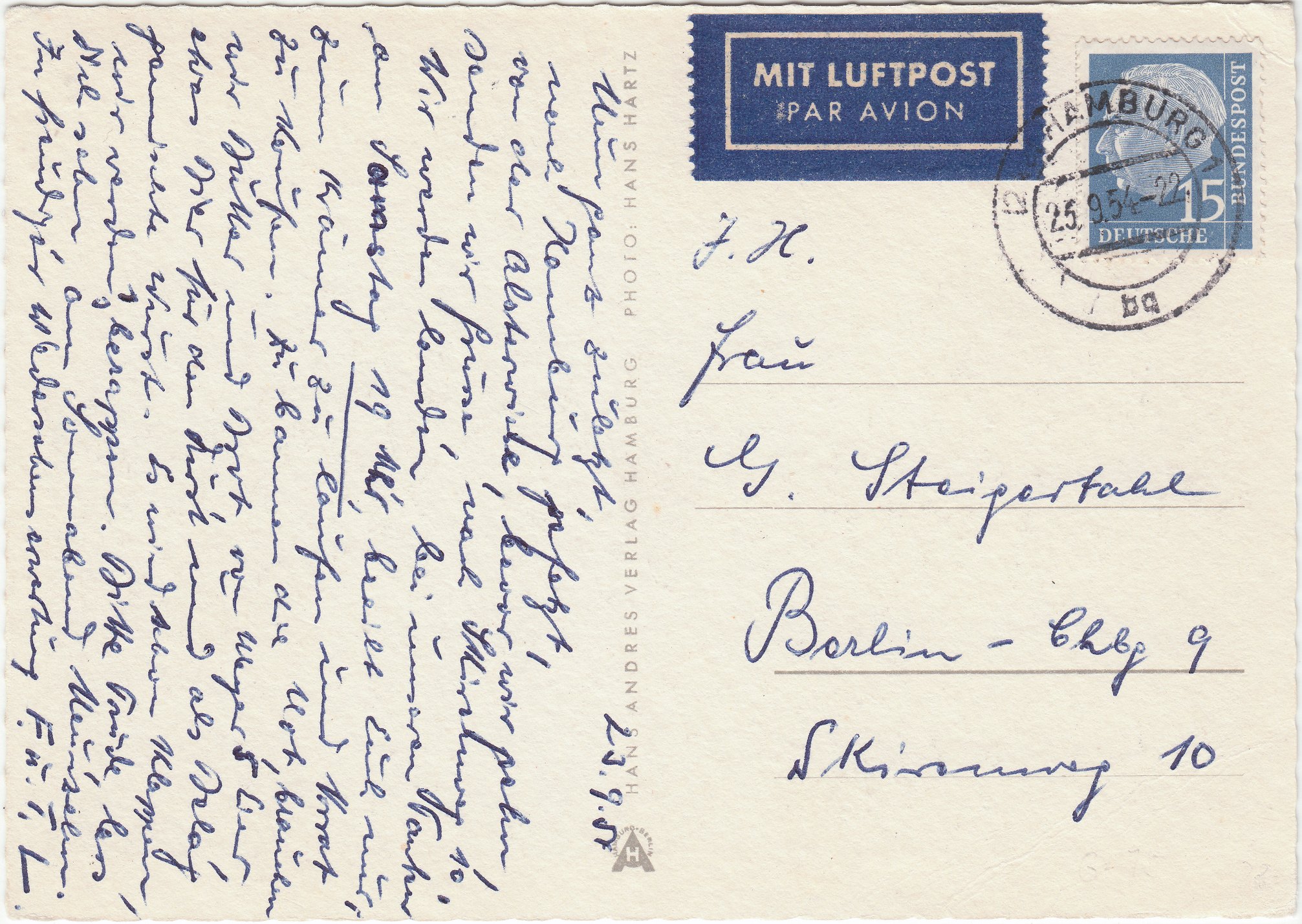 Diese Postkarte im Fernverkehr (10 Pf) per Luftpost (5 Pf), portogerecht frankiert per EF mit 15 Pf Heuss wurde am 23.09.1954 in Hamburg aufgegeben und dokumentiert somit die Flugstrecke Hamburg-Berlin: