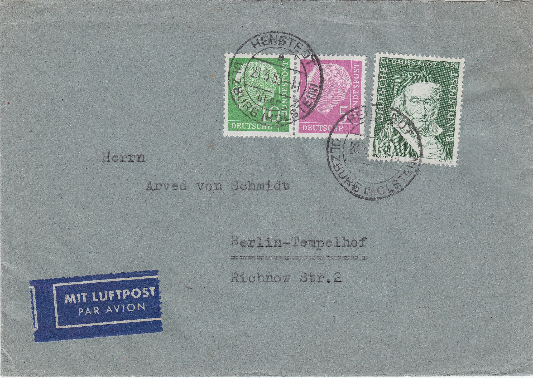Dieser Brief (20 Pf) per Luftpost (5 Pf) wurde am 28.03.1955 in Henstedt über Ulzburg (Holstein) aufgegeben: