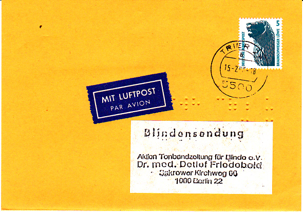 Einzelfrankatur des 5 Pfennigwertes der Dauerserie SWK (hier eine Rollenmarke) zur Entrichtung des von der Bundesrepublik nach Berlin geltenden Luftpostzuschlags bei einer portofreien Blindensendung, portogerecht vom Ersttag 15.02.1990 mit Tagesstempel Trier 29.