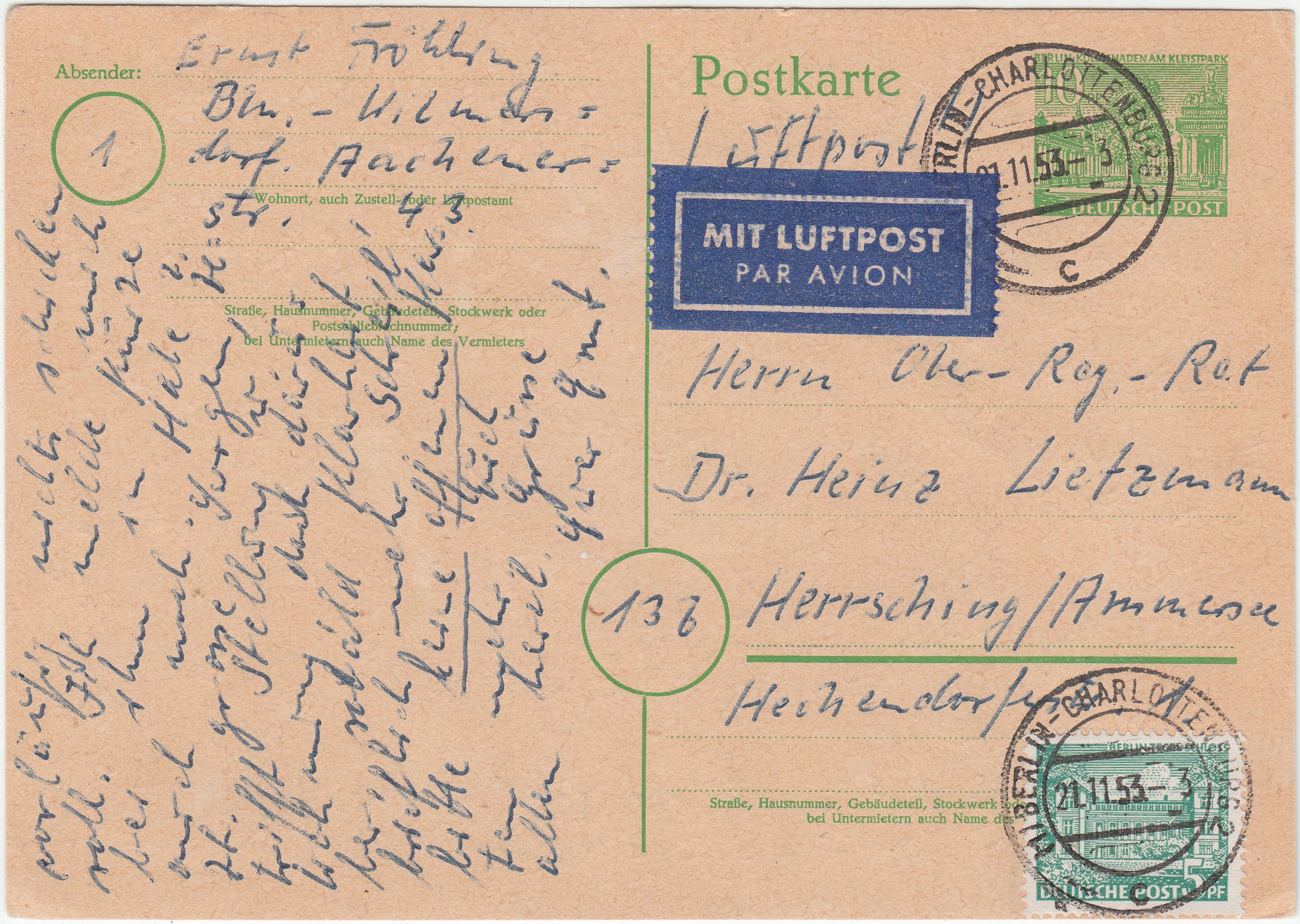 Postkarte (10 Pf) per Luftpost (5 Pf) am 21.11.1953 aufgegeben in Berlin-Charlottenburg 2, adressiert nach Herrsching am Ammersee, also per Luftpost gelaufen von Berlin bis München: