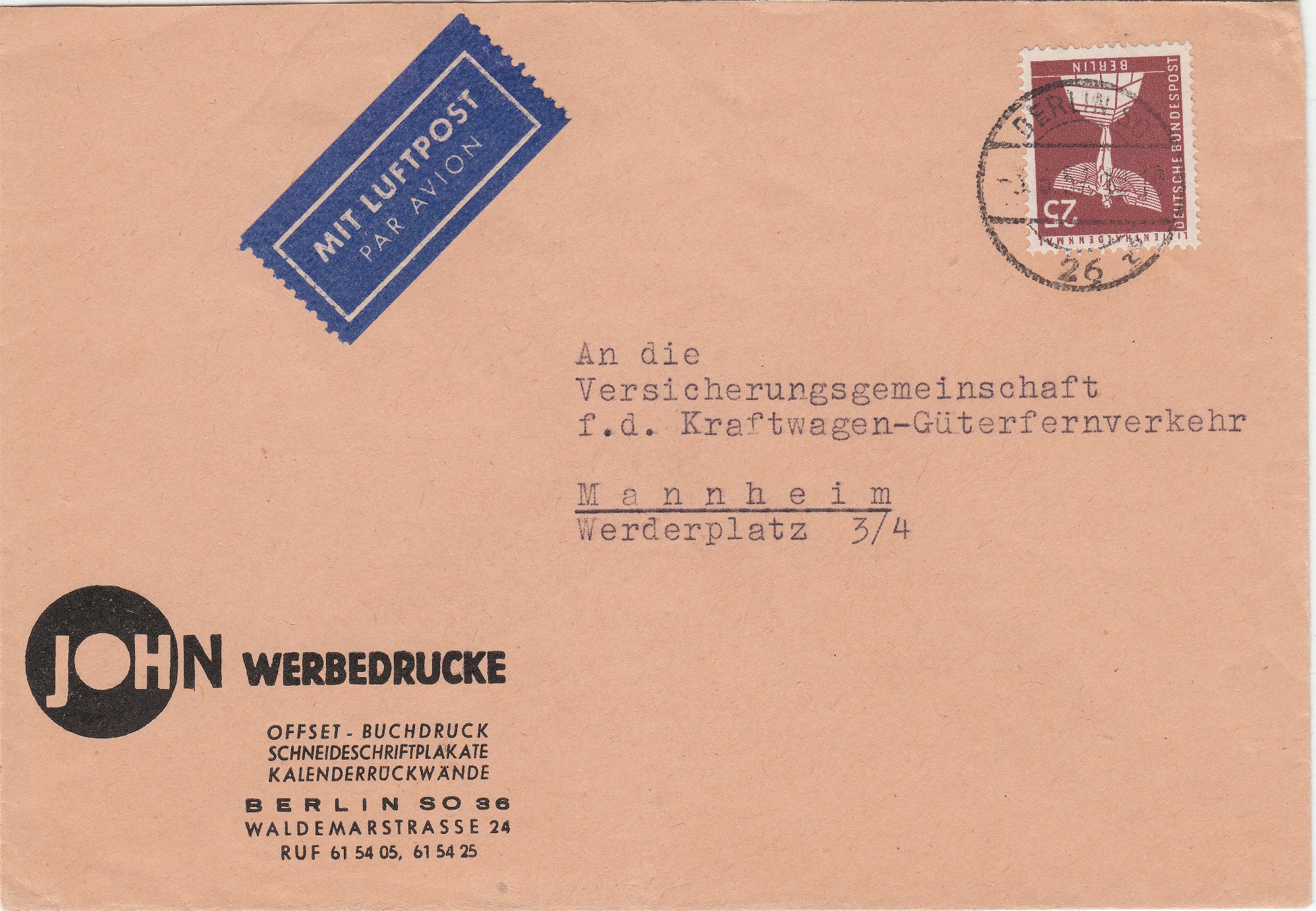 Brief (20 Pf) per Luftpost (5 Pf), frankiert per EF Berlin MiNr. 147 am 03.06.1957 aufgegeben in Berlin SO 26, adressiert nach Mannheim, also per Luftpost gelaufen von Berlin bis Frankfurt: