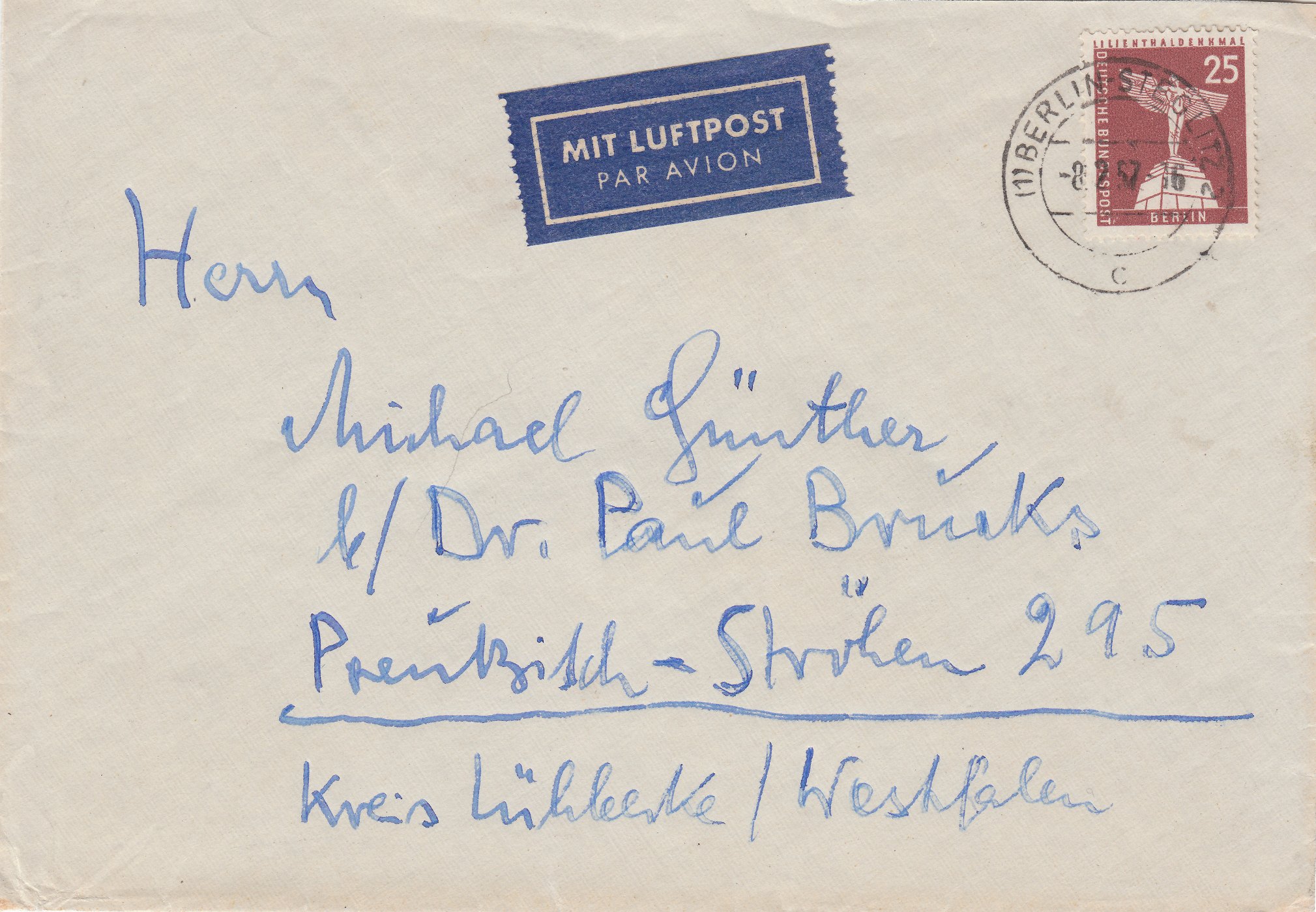 Der Brief wurde am 28.08.1957 als EF frankiert mit einer MiNr. Berlin 173: