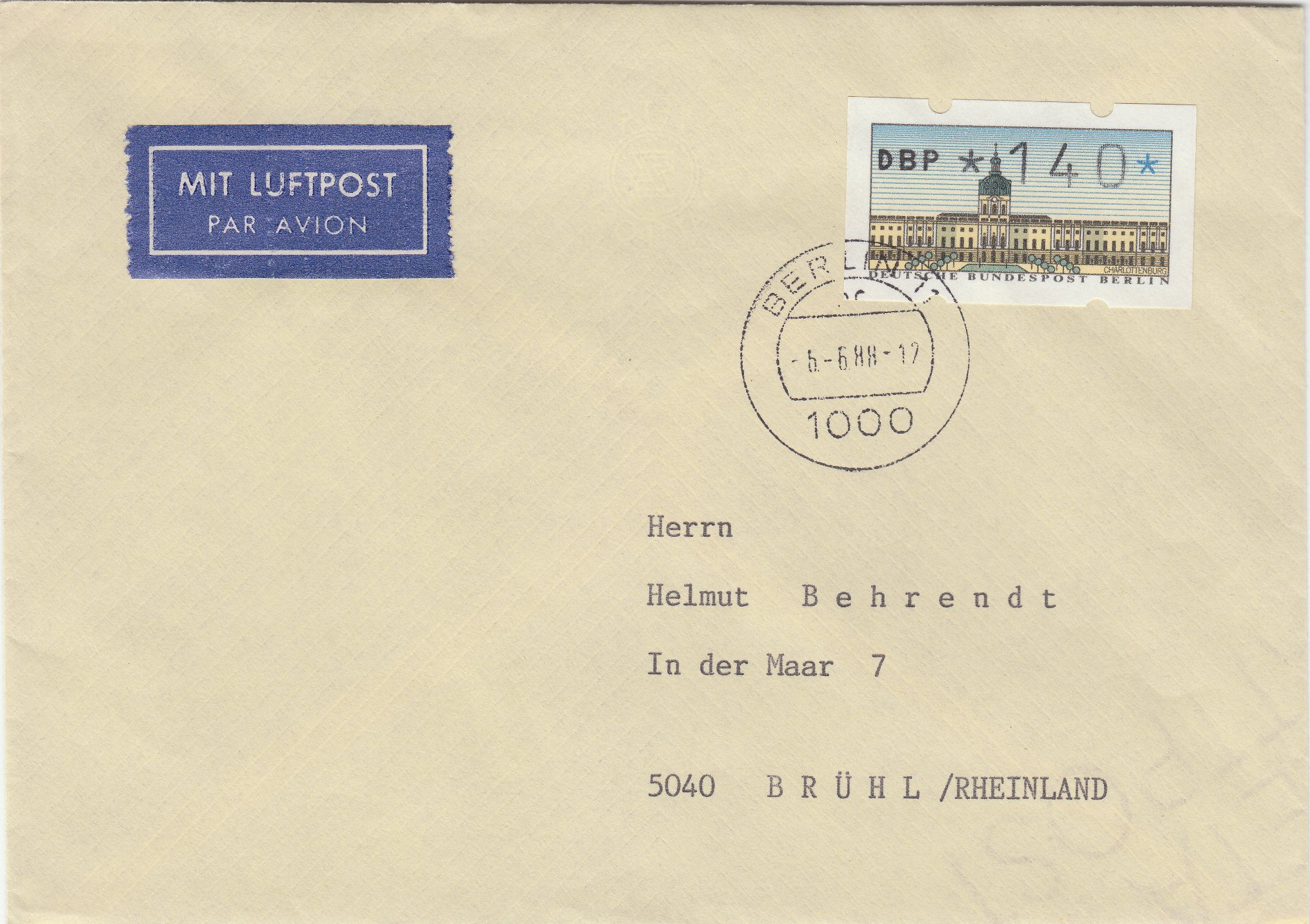 Brief von 21 bis 40 g im Fernverkehr (130 Pf) per Luftpost (5 Pf je 20 g), portogerecht frankiert per EF mit einer ATM Berlin MiNr. 1 am 06.06.1988 der Wertstufe 140 Pf, aufgegeben in Berlin 11, adressiert nach Brühl, also per Luftpost gelaufen von Berlin bis Köln:
