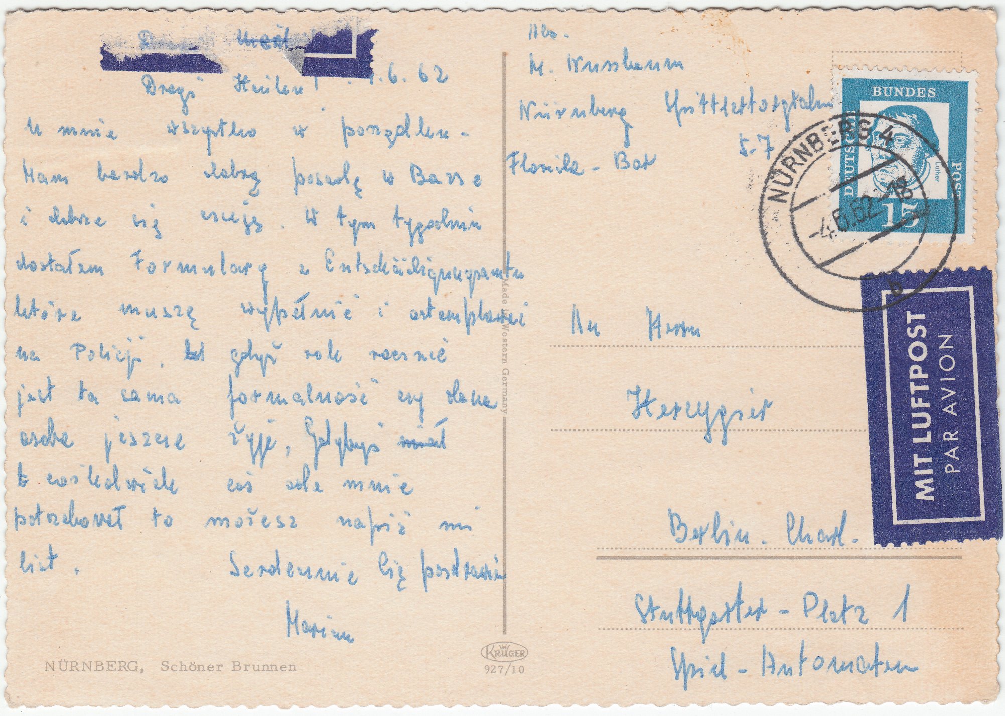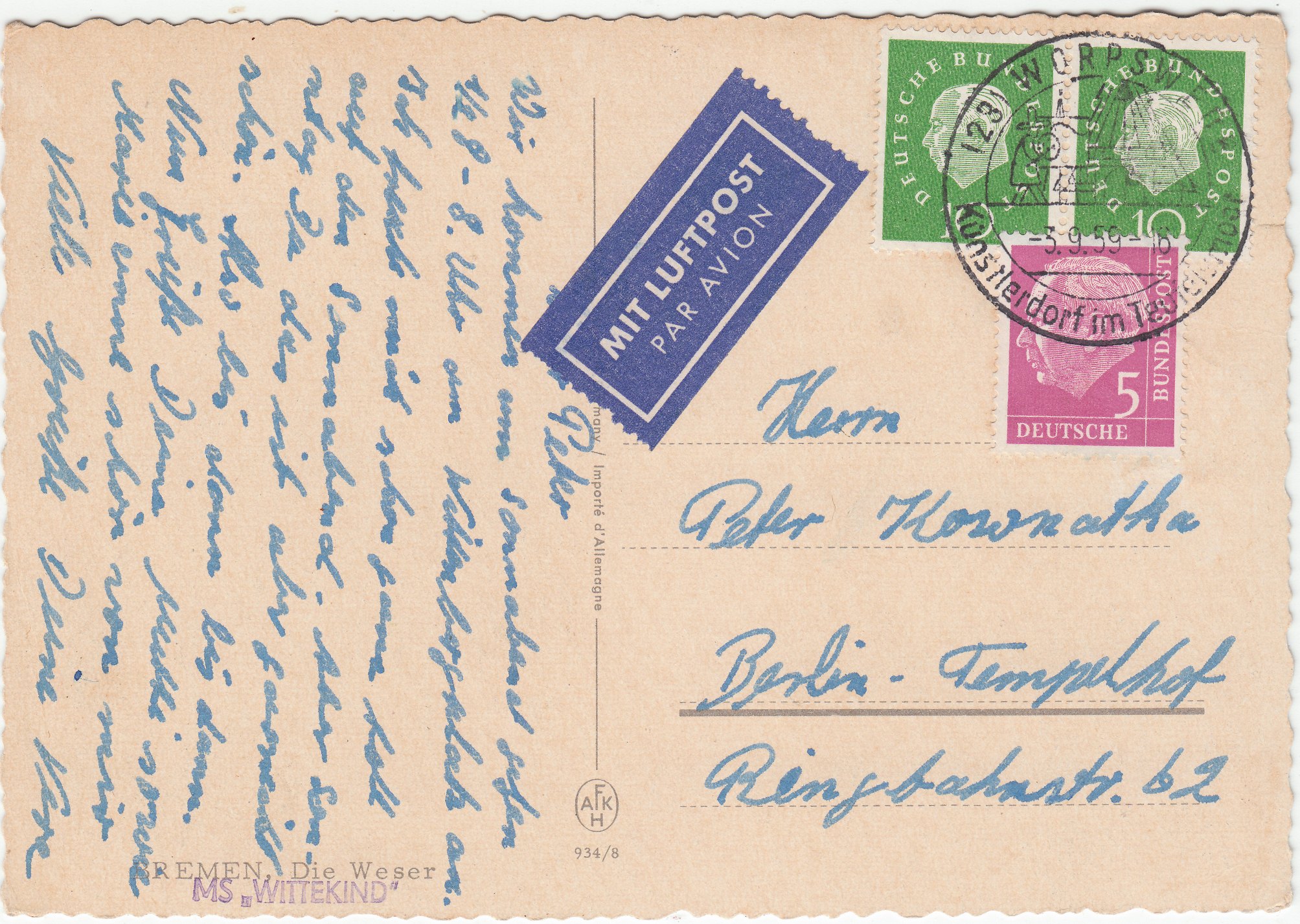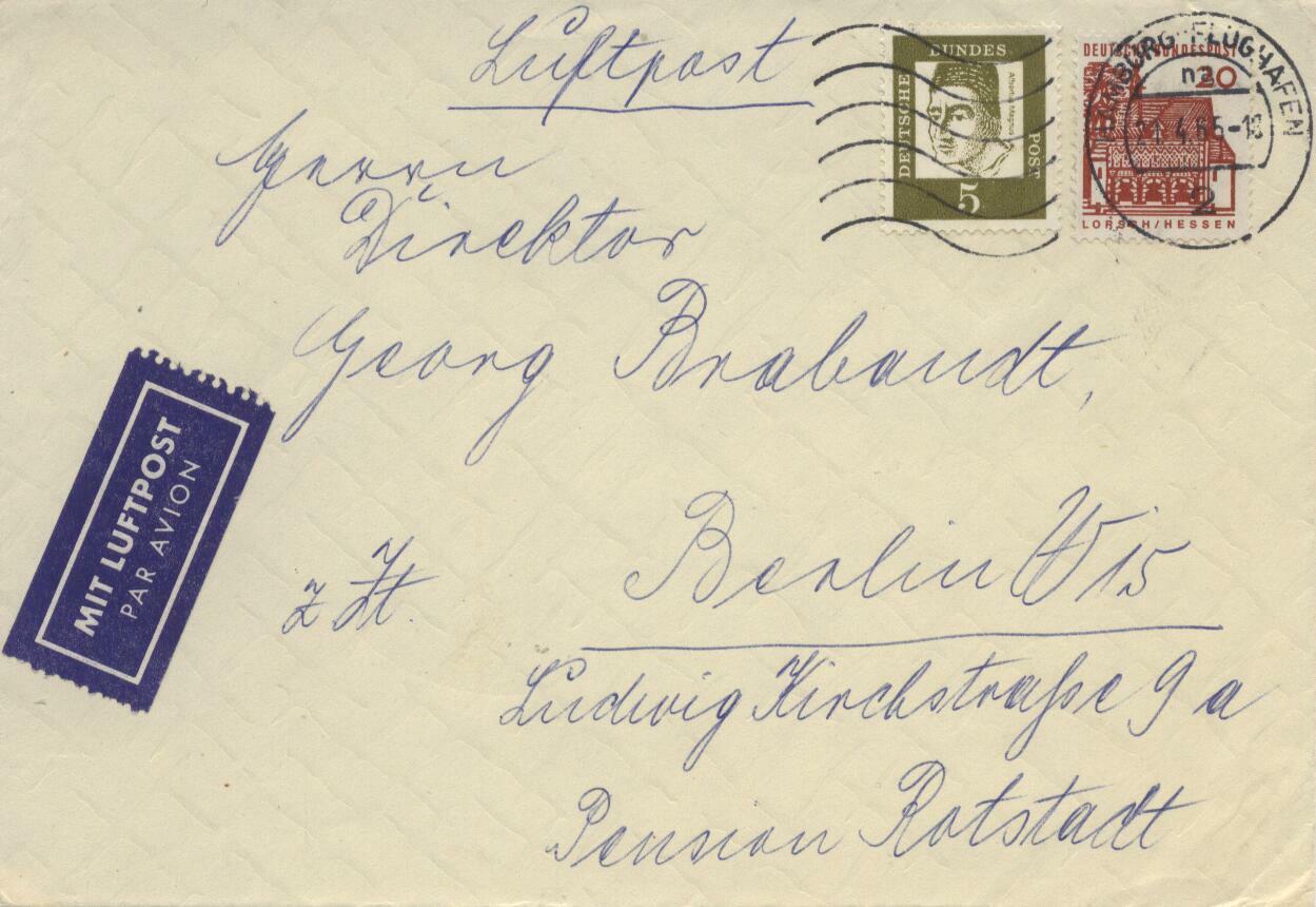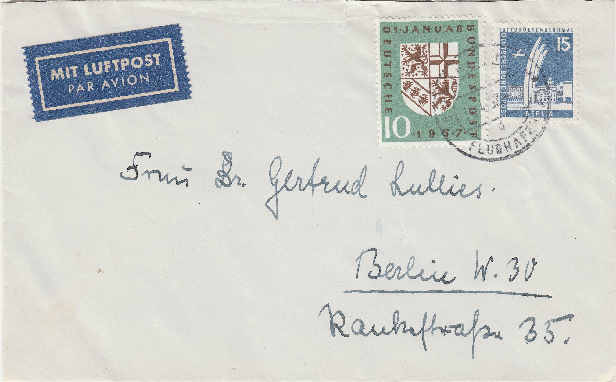 Der Brief wurde am 16.02.1959 frankiert mit einem 5 Pf-Wert Heuss I sowie einem 20 Pf-Wert Freimarke Berliner Stadtbilder: