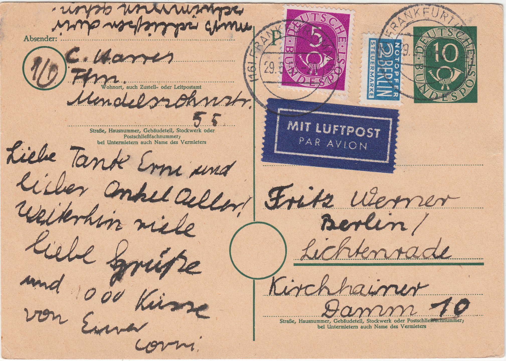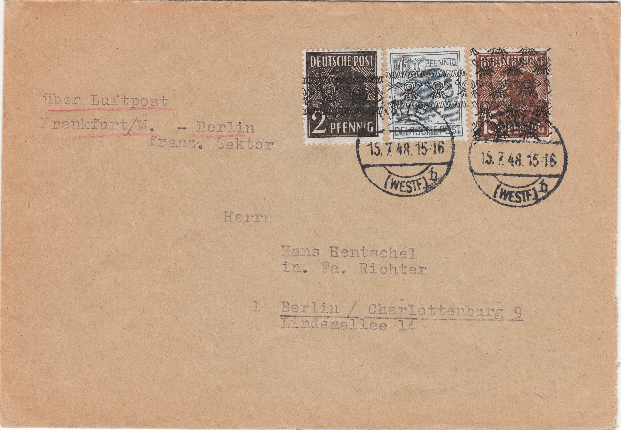 Standardbrief bis 20 g im Fernverkehr, Porto 20 Pf, per Luftpost, Luftpostgebühr 5 Pf, mit 25 Pf demnach portogerecht freigemacht, gelaufen von Recklinghausen nach Berlin, per Luftpost also von Düsseldorf bis Berlin.