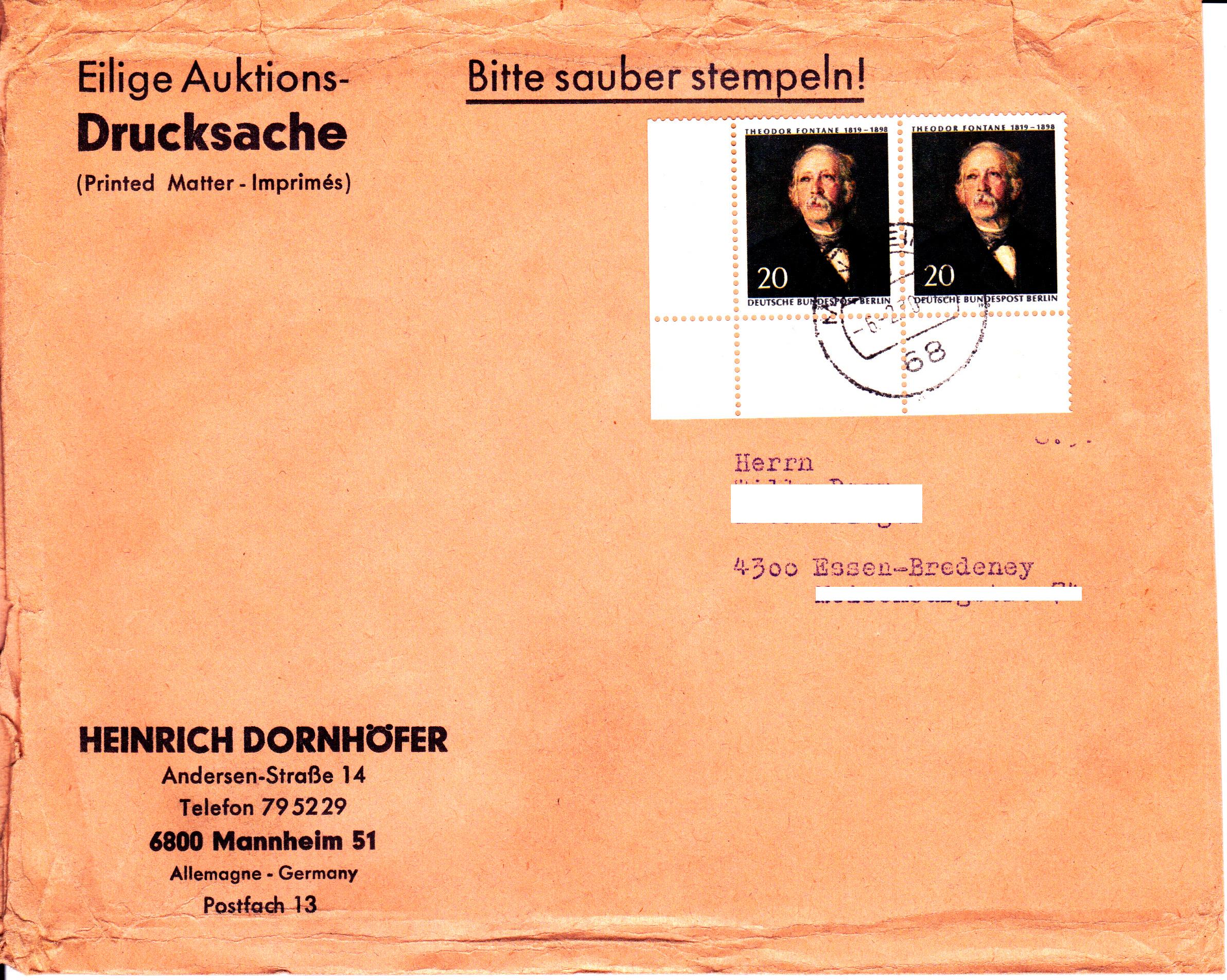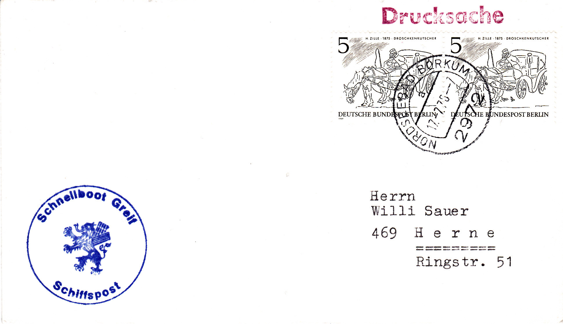 Umschlag mit zwei Marken zu 5 Pfennig aus der Serie "Berliner des 19.Jahrhunderts" (MiNr 330) als Drucksache bis 20 Gramm am 17.7.1970 in Borkum zur Post gegeben.