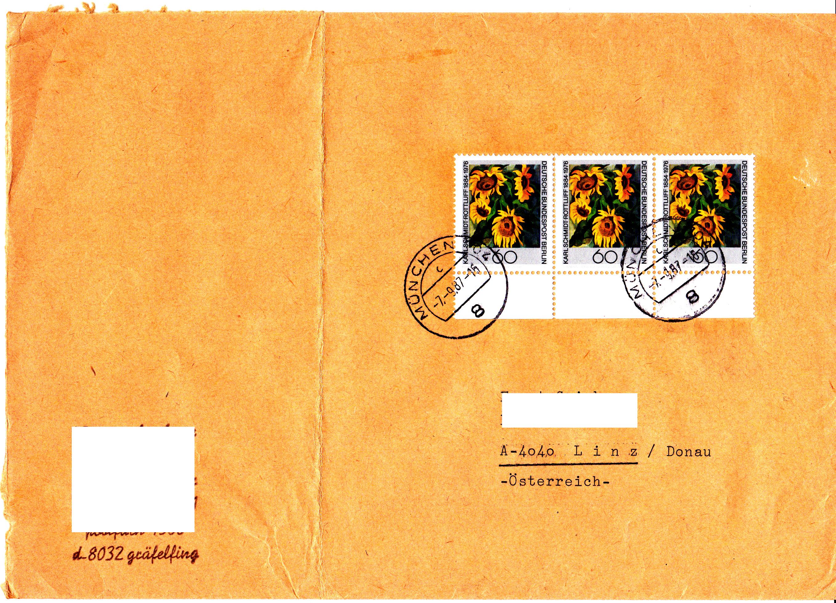 Hier wurden am 7.9.1987 zur portogerechten Frankatur eines Briefes von 21 bis 50 g ins Ausland drei Werte der Sondermarke zum 100. Geburtstages von Karl-Schmidt-Rottluff (MiNr 728) benutzt.