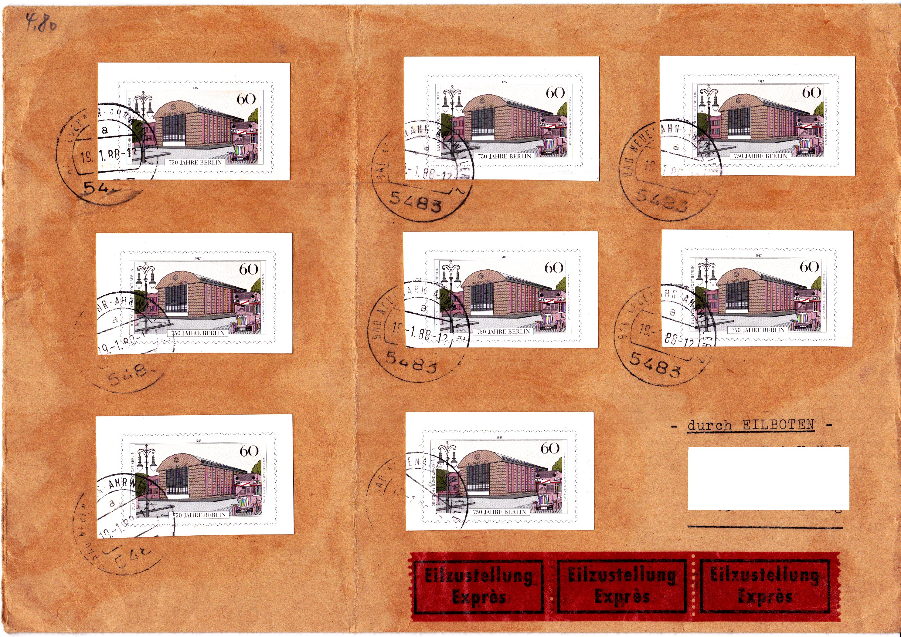 Acht Ganzsachenausschnitte der Sonderpostkarte mit dem Wertzeicheneindruck der MiNr 774 wurden hier 19.1.1988 verklebt zum portogerechten Frankieren eines Briefes von 21 bis 50g (Portostufe 130 Pf) mit Eilzustellung (Porto 350 Pf).