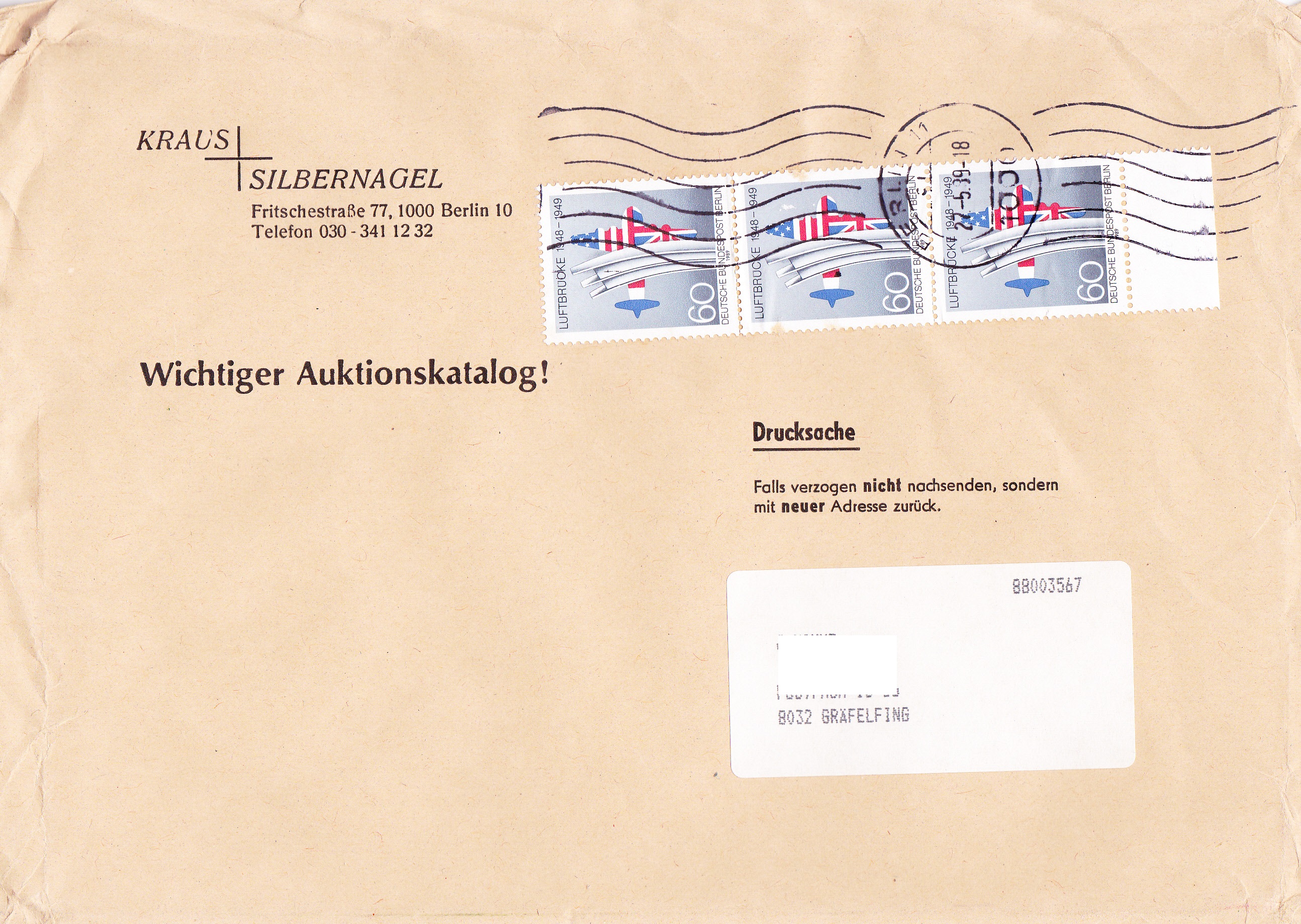 Auf dieser Drucksache von 101 bis 250 g wurde ein Dreierstreifen der Sondermarke zum 40.Jahrestag der Beendigung der Luftbrücke (MiNr 842) portogerecht verwendet.