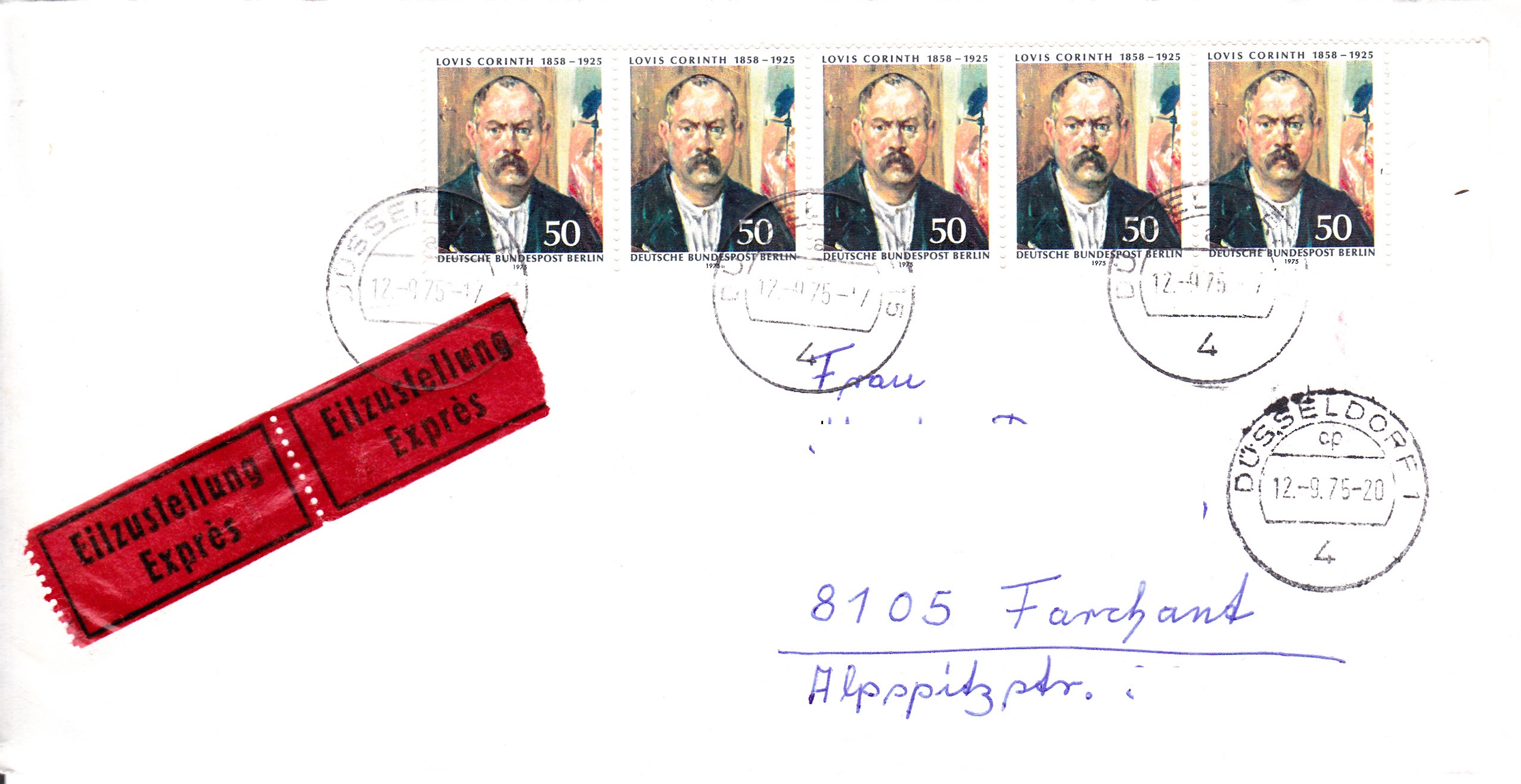 Waagrechter Fünferstreifen der Sondermarke "50. Todestag von Lovis Corinth" portogerecht auf einem Brief bis 20 g mit Eilzustellung von Düsseldorf 5 nach Farchant. Das Porto betrug: Briefporto bis 20 g 50 Pf, Eilzustellung 200 Pf, zusammen 250 Pf.