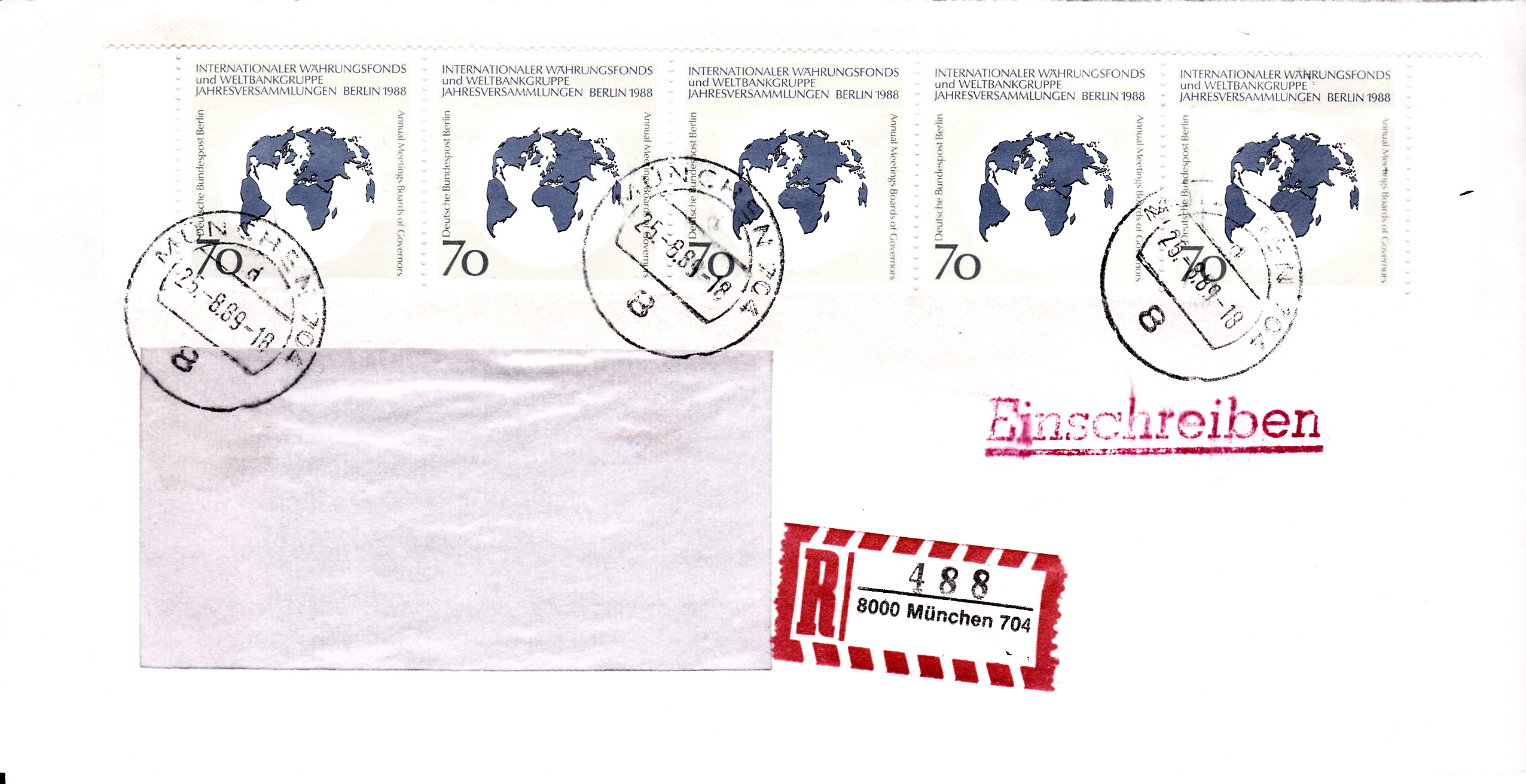 Fünferstreifen der Sondermarke "Jahrestagung des Internationalen Währungsfonds IWF" (MiNr 817) auf einem Einschreibebrief bis 20 g vom25.8.1989. Das Porto betrug für den Brief bis 20 g 100 Pf und für die Zusatzleistung Einschreiben 250 Pf.