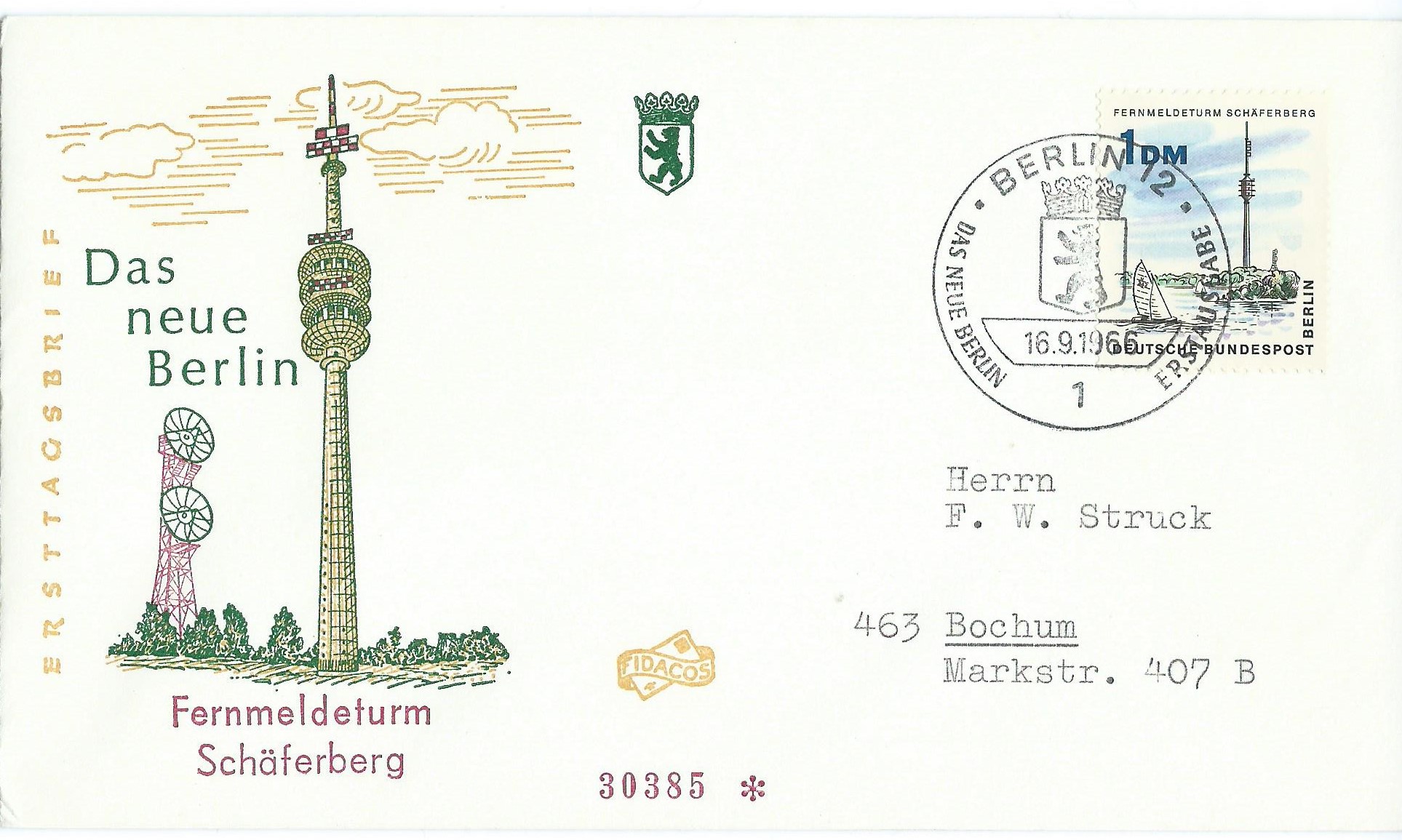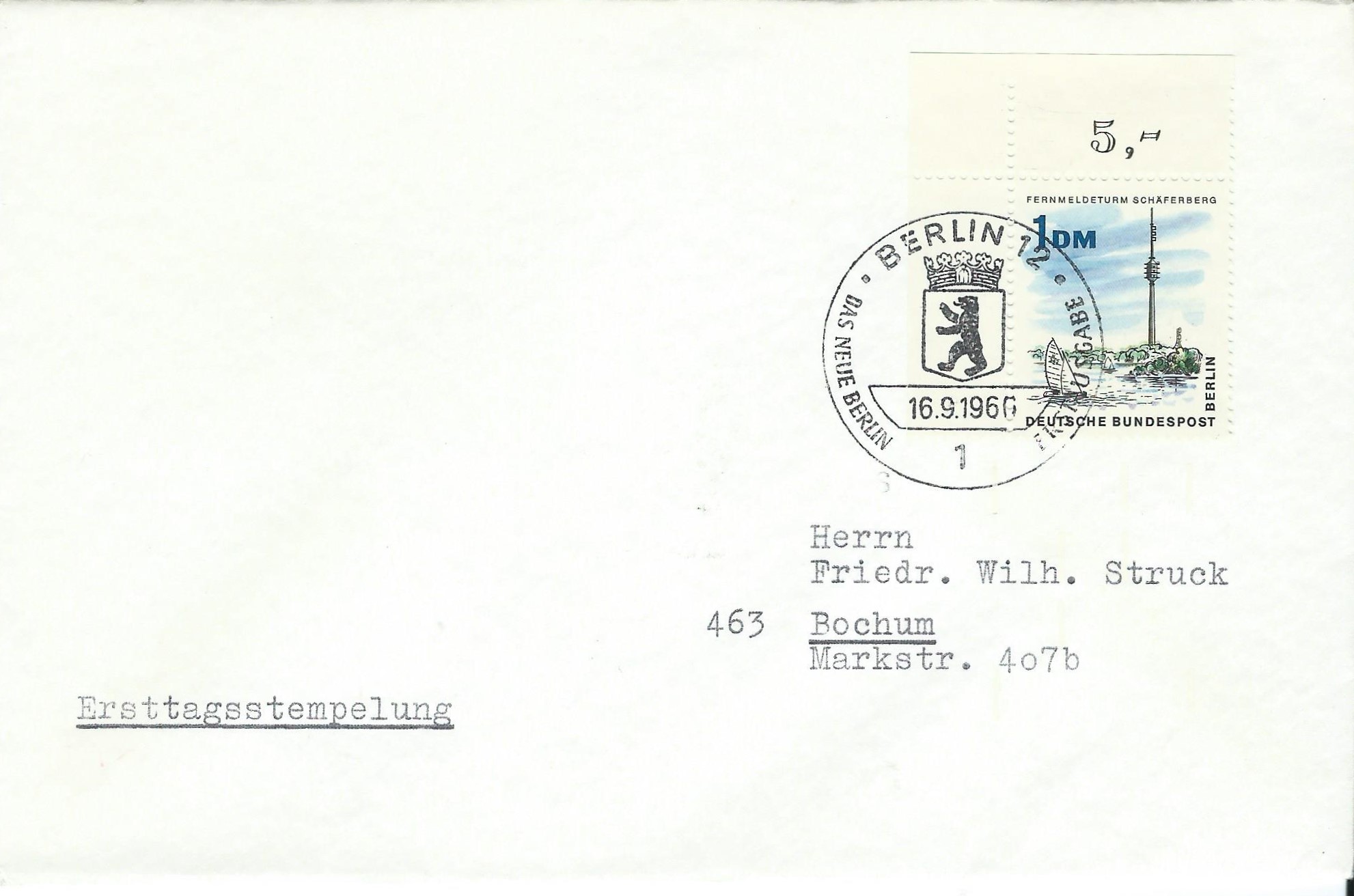 Der Wert zu 1 DM Fernmeldeturm Schäferberg als Einzelfrankatur. Dieser Beleg wurde mit dem Ersttagssonderstempel Berlin am 16.9.66 gestempelt.
