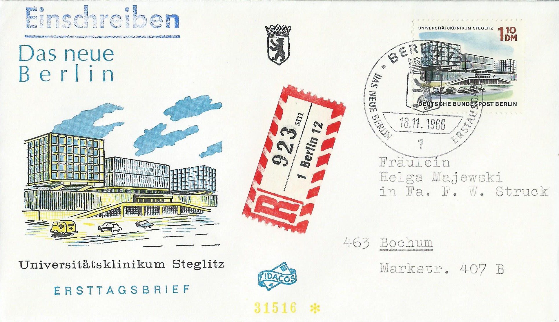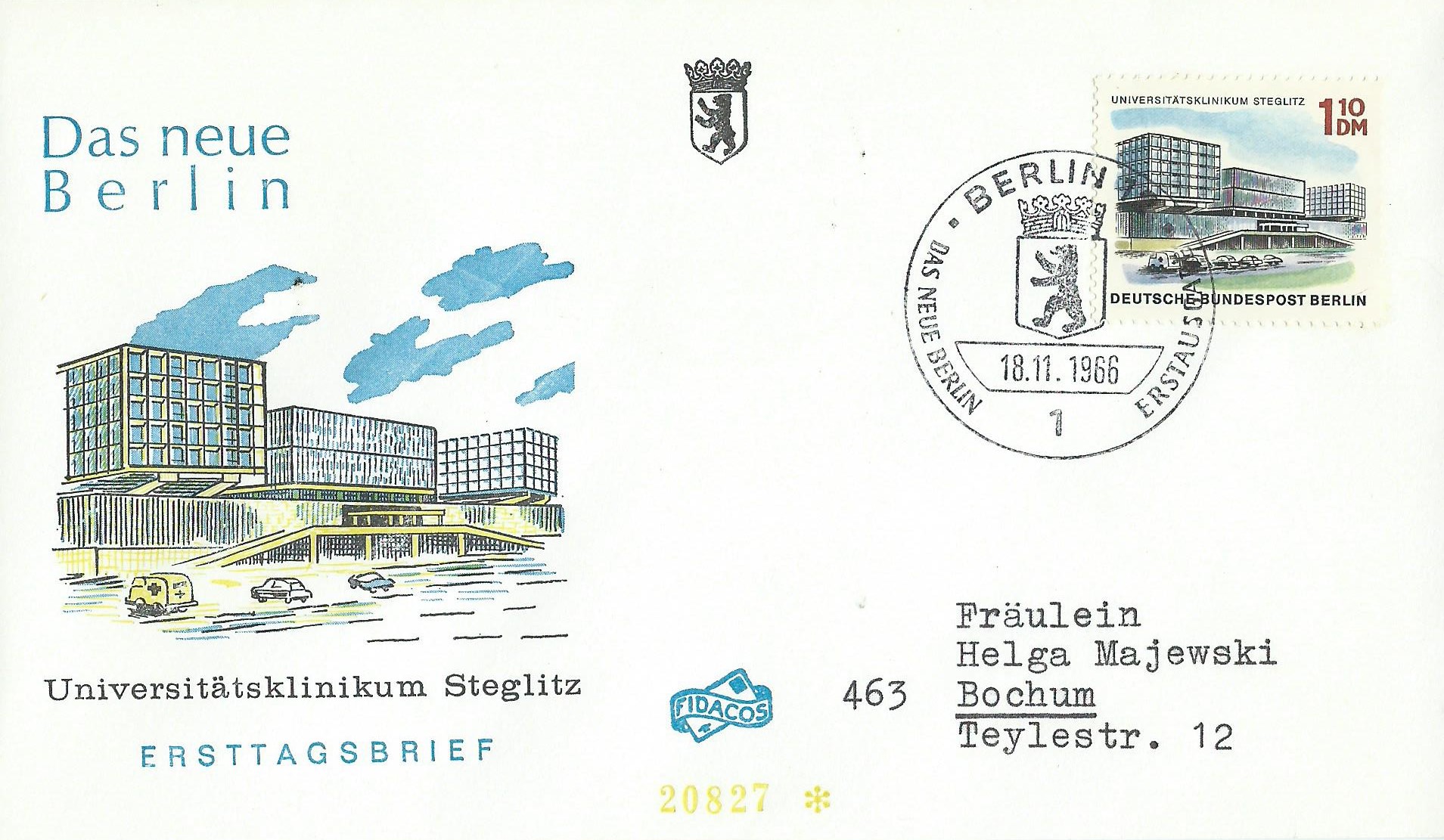 Der Wert zu 1,10 DM Universitätsklinikum Steglitz als Einzelfrankatur. Dieser Beleg wurde mit dem Ersttagssonderstempel Berlin am 18.11.66 gestempelt.