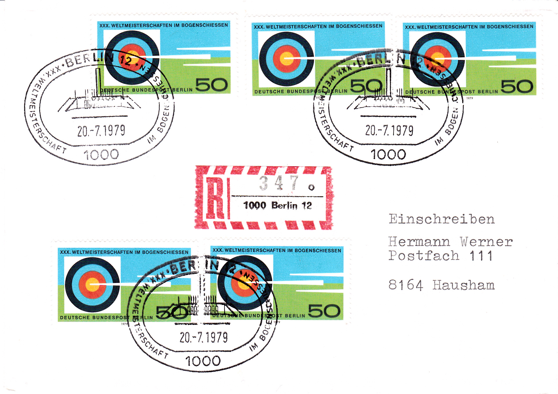 Hier wurden fünf Marken der Ausgabe "XXX. Weltmeisterschaften im Bogenschießen in Berlin" (MiNr 599) auf einem Brief von 21 bis 50 Gramm per Einschreiben als Porto verwendet und mit dem dazu passenden Ersttagsonderstempel gestempelt. Das Porto betrug für einen Brief mit 21 bis 50 Gramm 100Pf und für die Sonderleistung Einschreiben 150Pf.