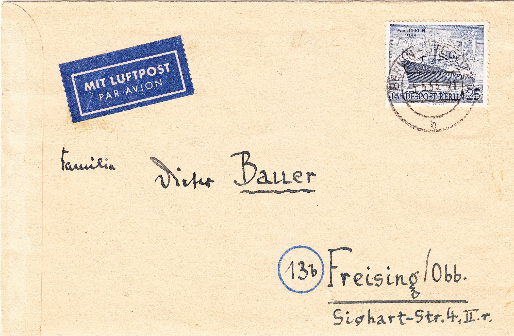 Dieser nach Ansbach in Mittelfranken adressierte, am 17.11.1950 in BERLIN-WILMERSDORF aufgegebene Brief wurde per Inlandsluftpost von Berlin nach Nürnberg befördert:
