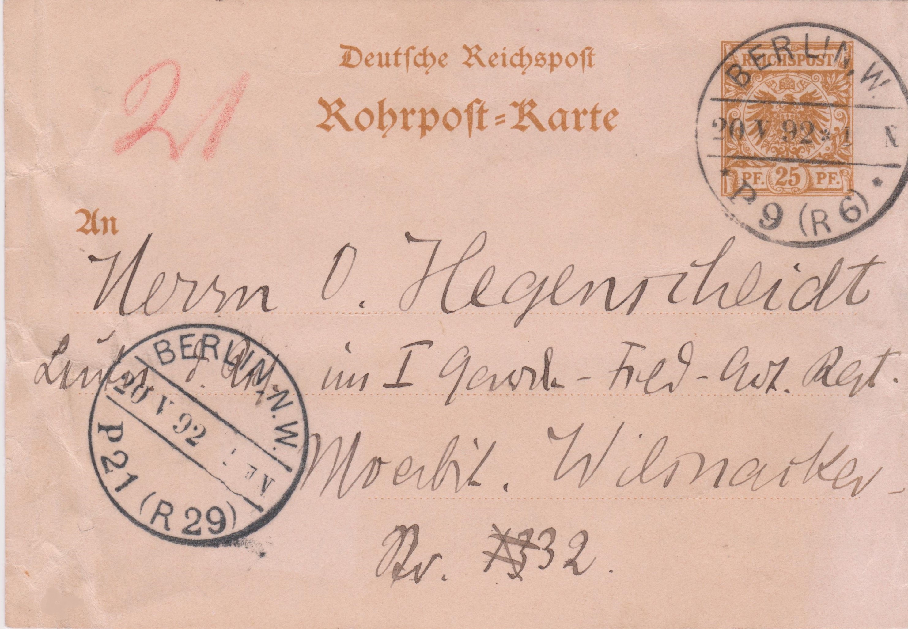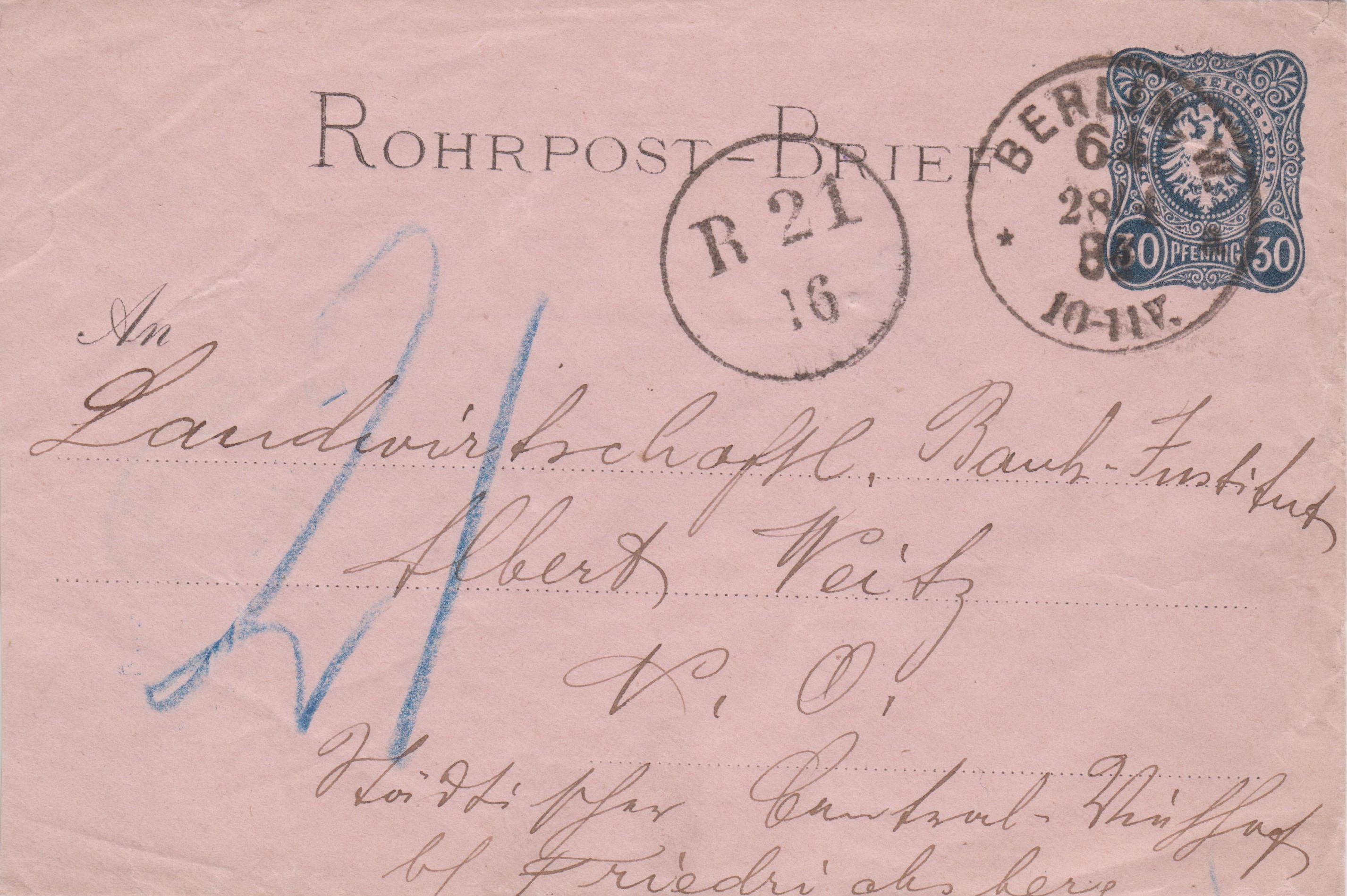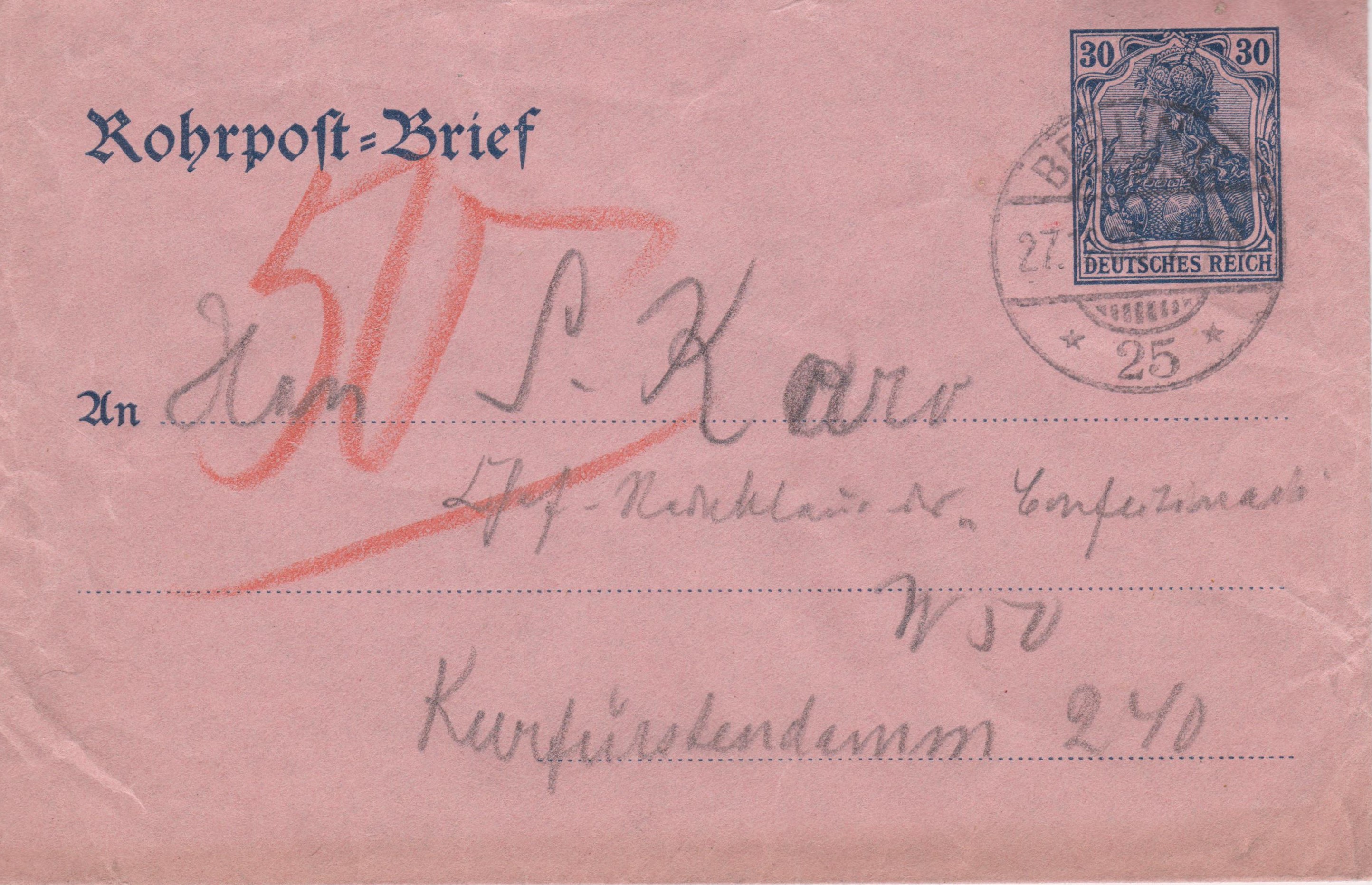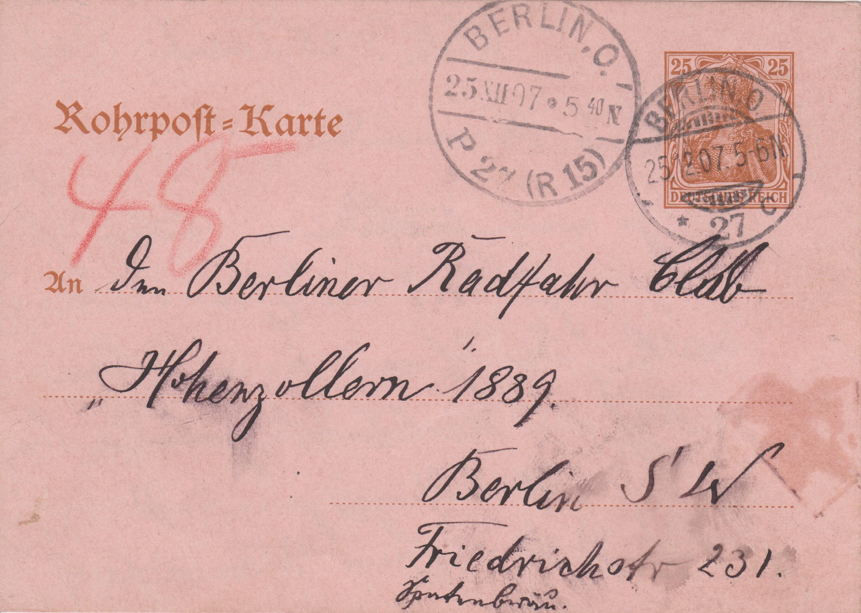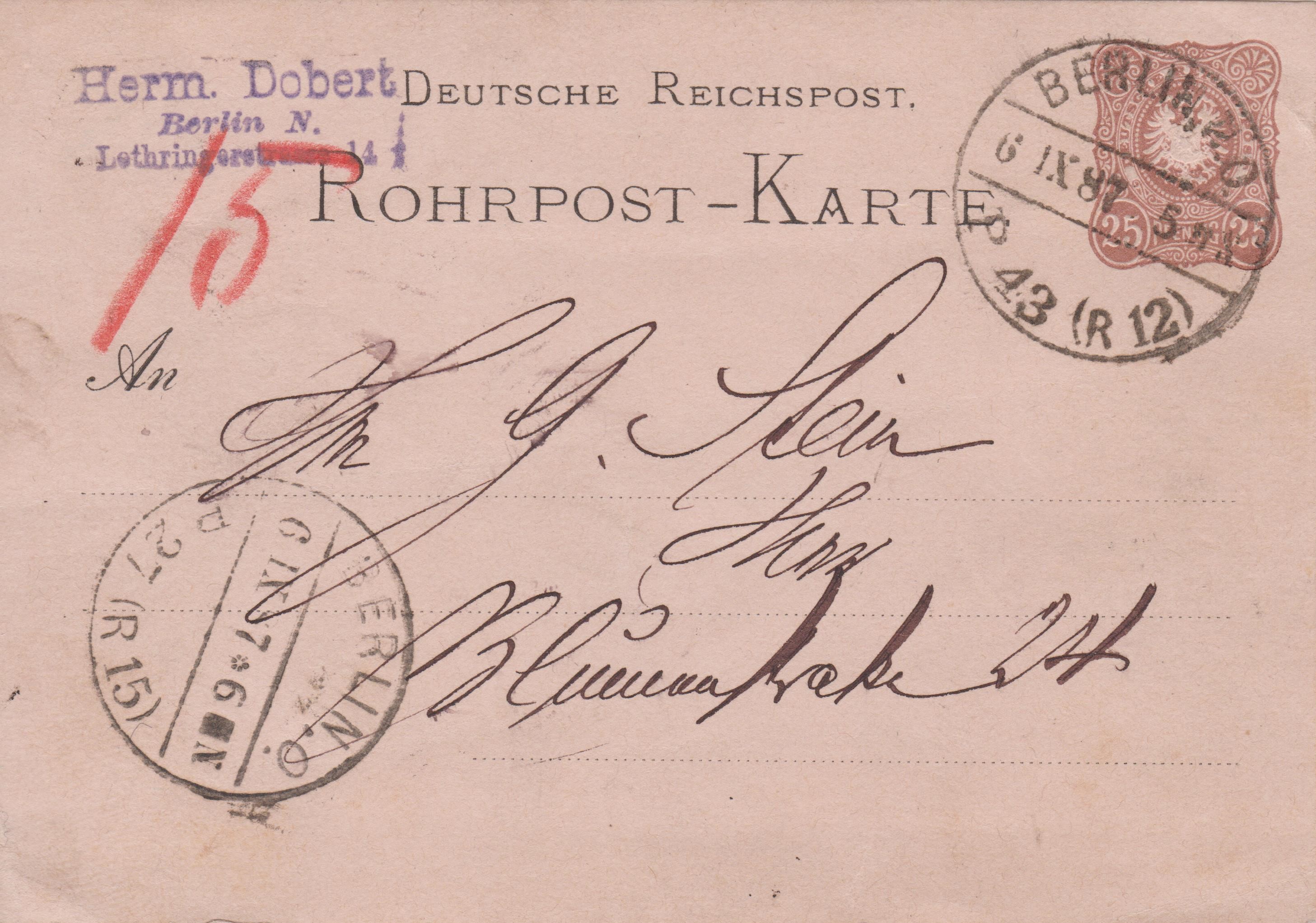 Ganzsache Deutsches Reich "Rohrpost-Brief", MiNr. RU 6, aufgegeben am 24.12.1912 um "4 50 N." in "BERLIN, W. 64", per Rohrpost befördert nach "15", rückseitig Ankunftstempel der Rohrpost "BERLIN, W. 15 24.12.12 5 40N.":