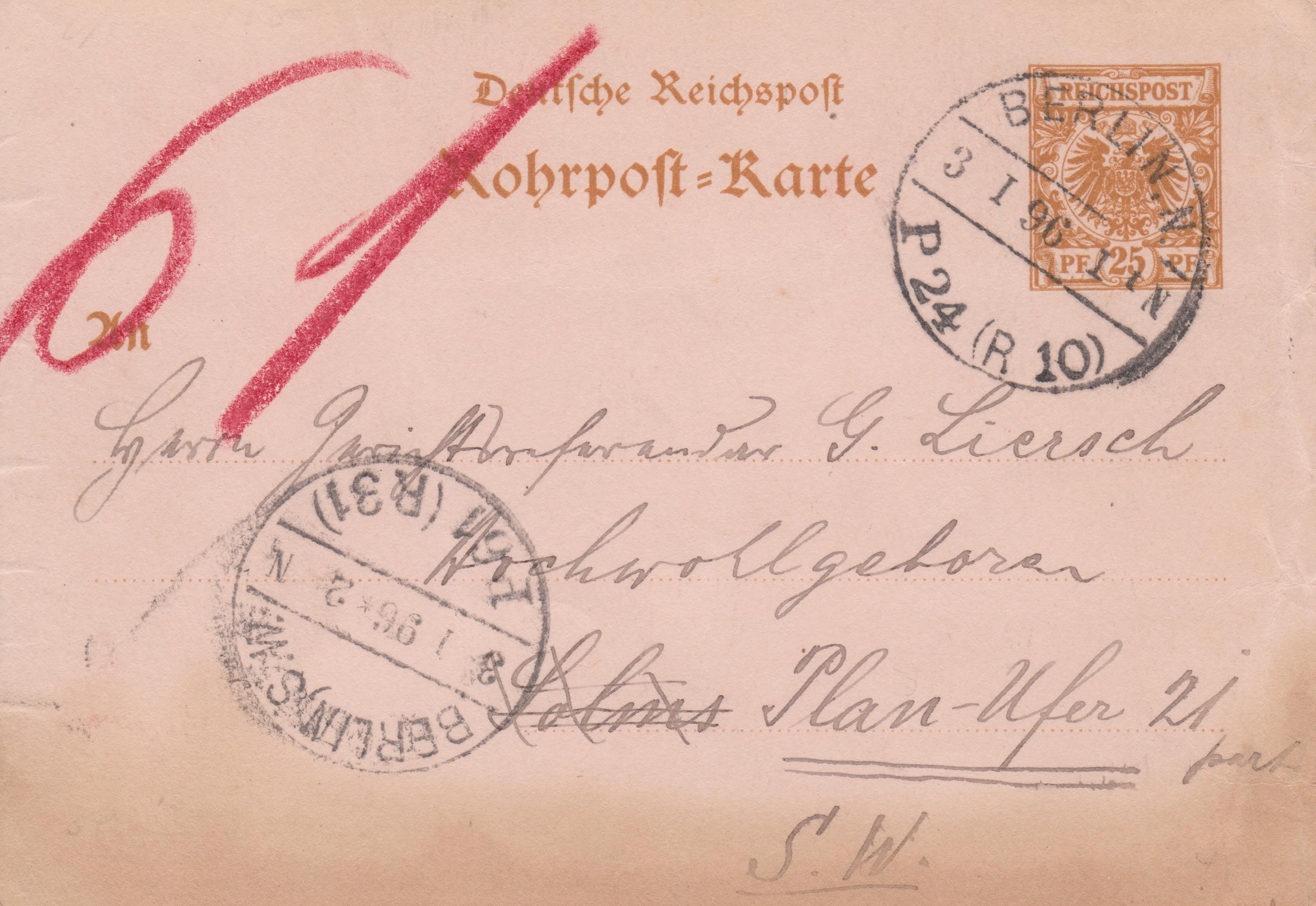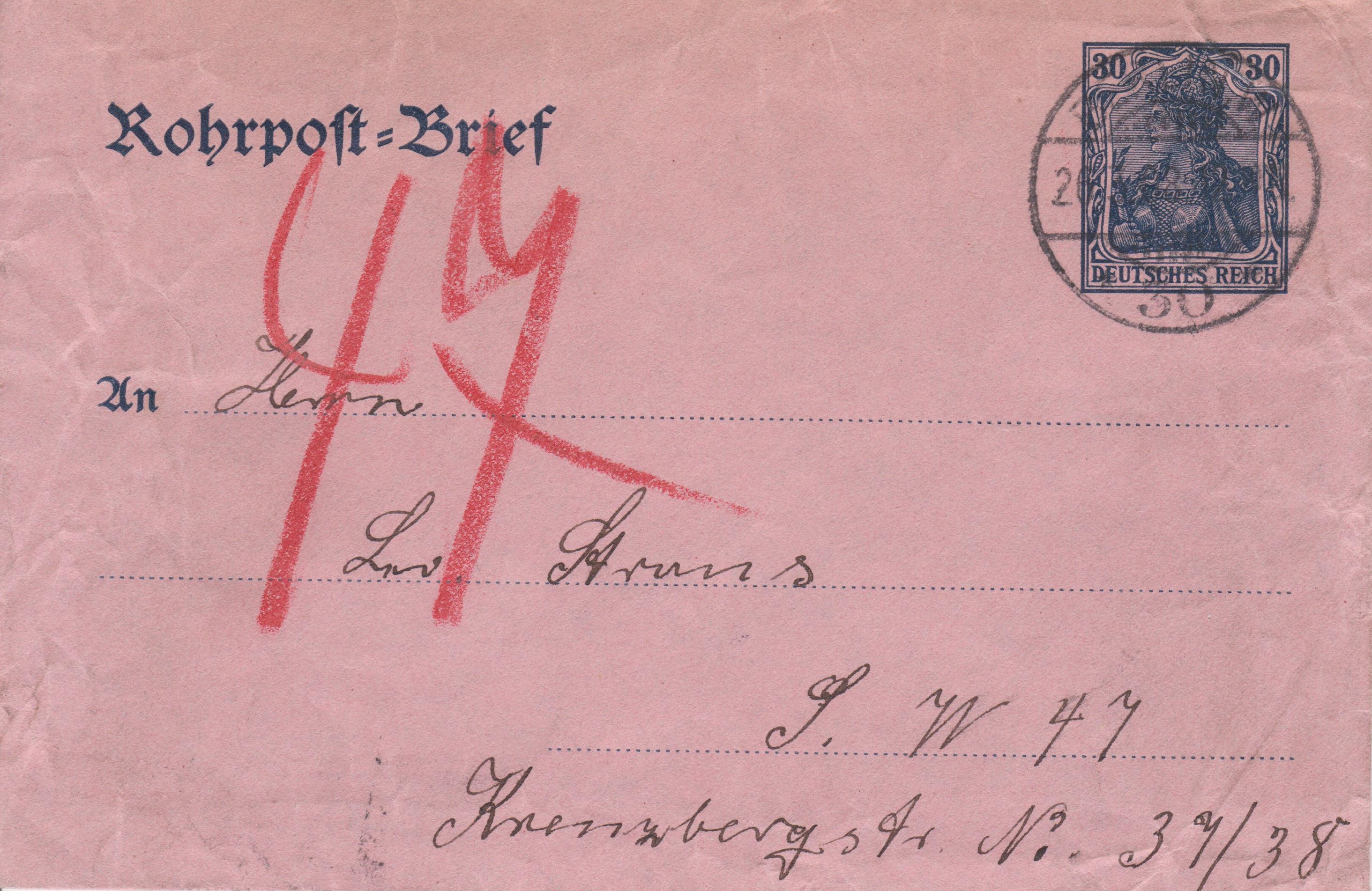 Handschriftlicher Leitvermerk in Rot "61" => per Rohrpost befördert nach "BERLIN, S. W. P 61 (R 31)".