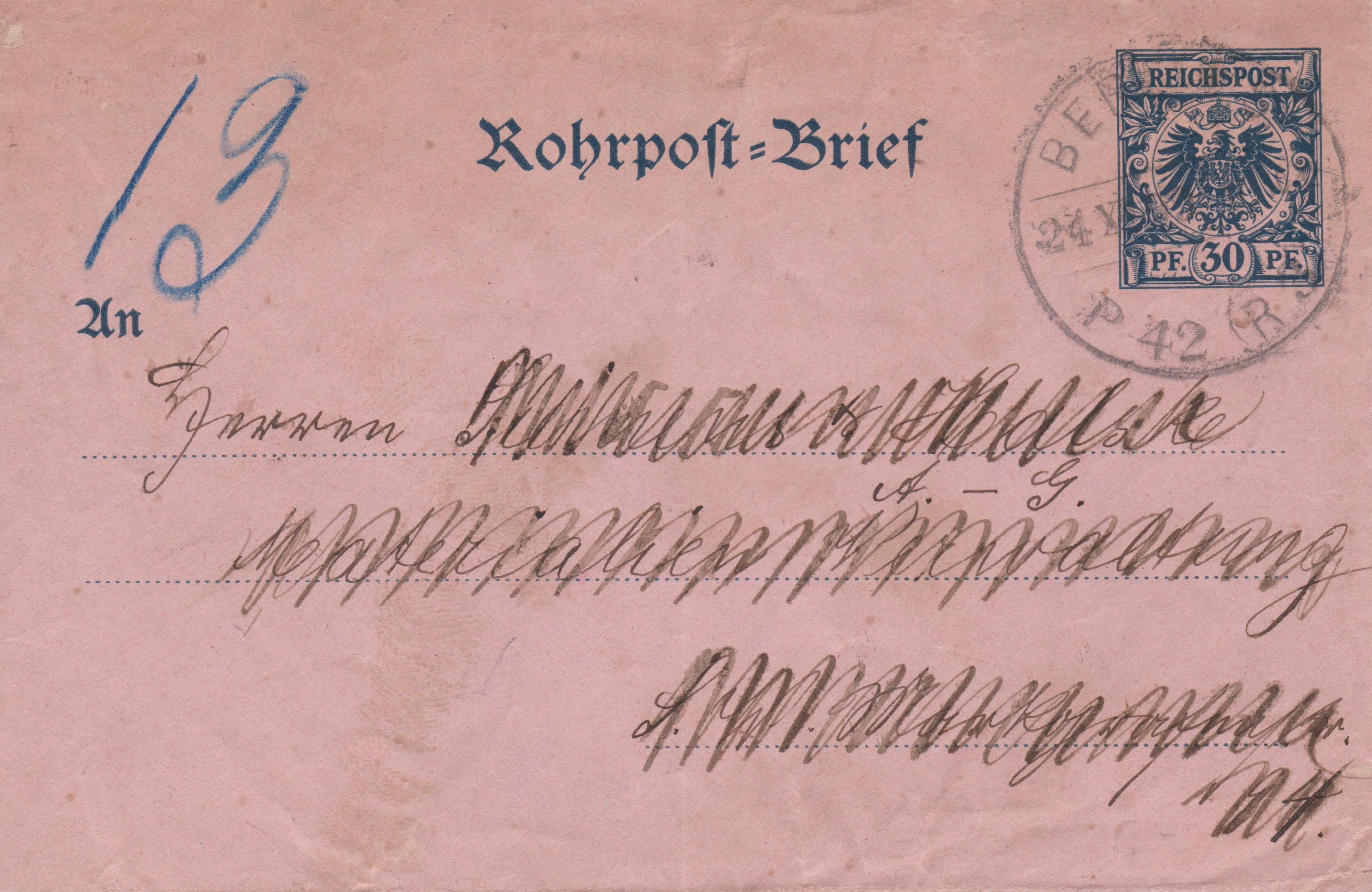 Ganzsache Deutsches Reich "Rohrpost-Brief", MiNr. RU 6, aufgegeben am 24.11.1899 in "BERLIN P 42 (R 3)", handschriftlicher Leitvermerk der Rohrpost in Blau "13", befördert per Berliner Rohrpost: