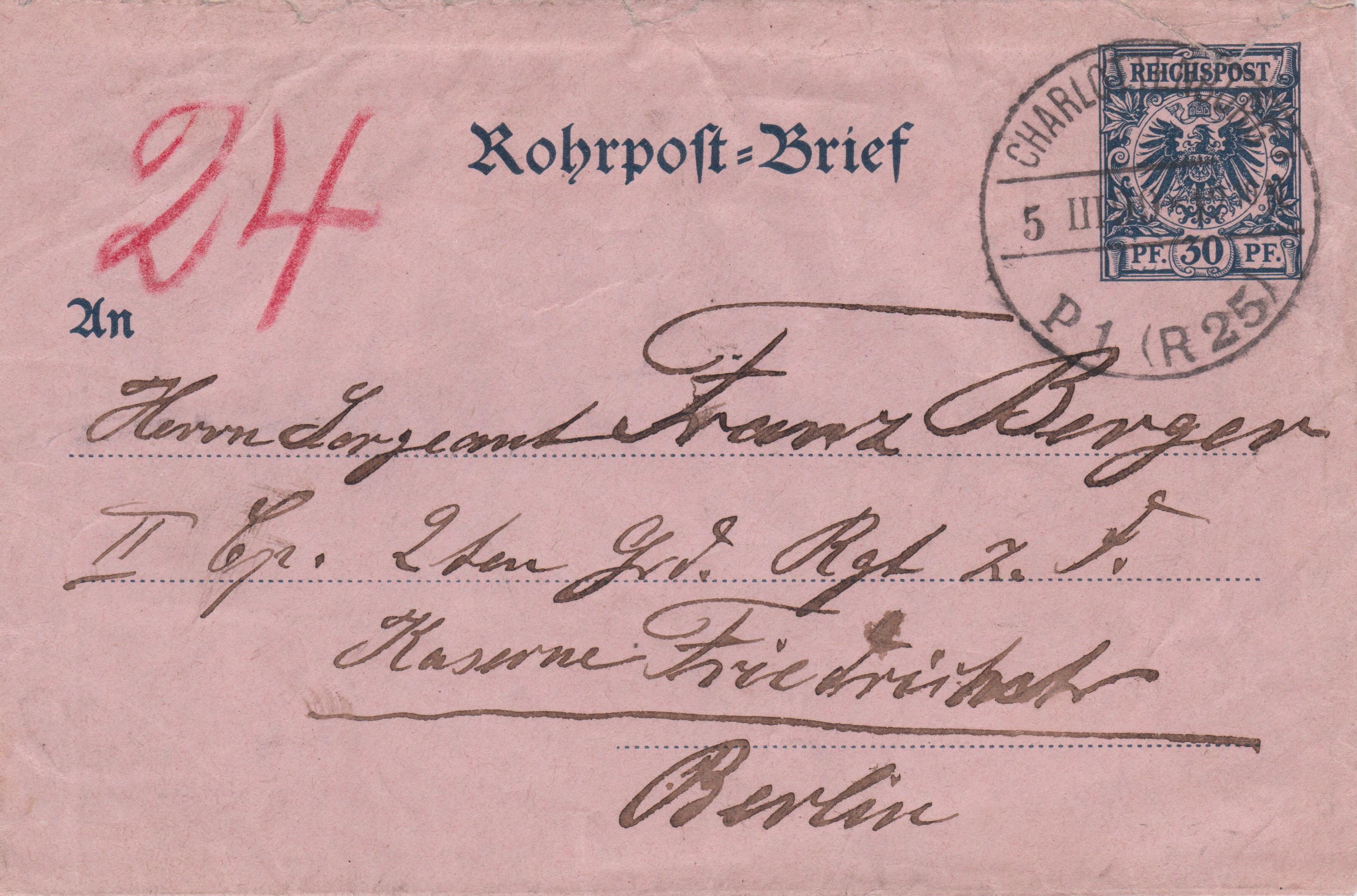 Ganzsache Deutsches Reich "Rohrpost-Brief", MiNr. RU 6, aufgegeben am 05.03.1899 in "CHARLOTTENBURG P 1 (R 25)", handschriftlicher Leitvermerk der Rohrpost in Rot "24", befördert per Berliner Rohrpost: