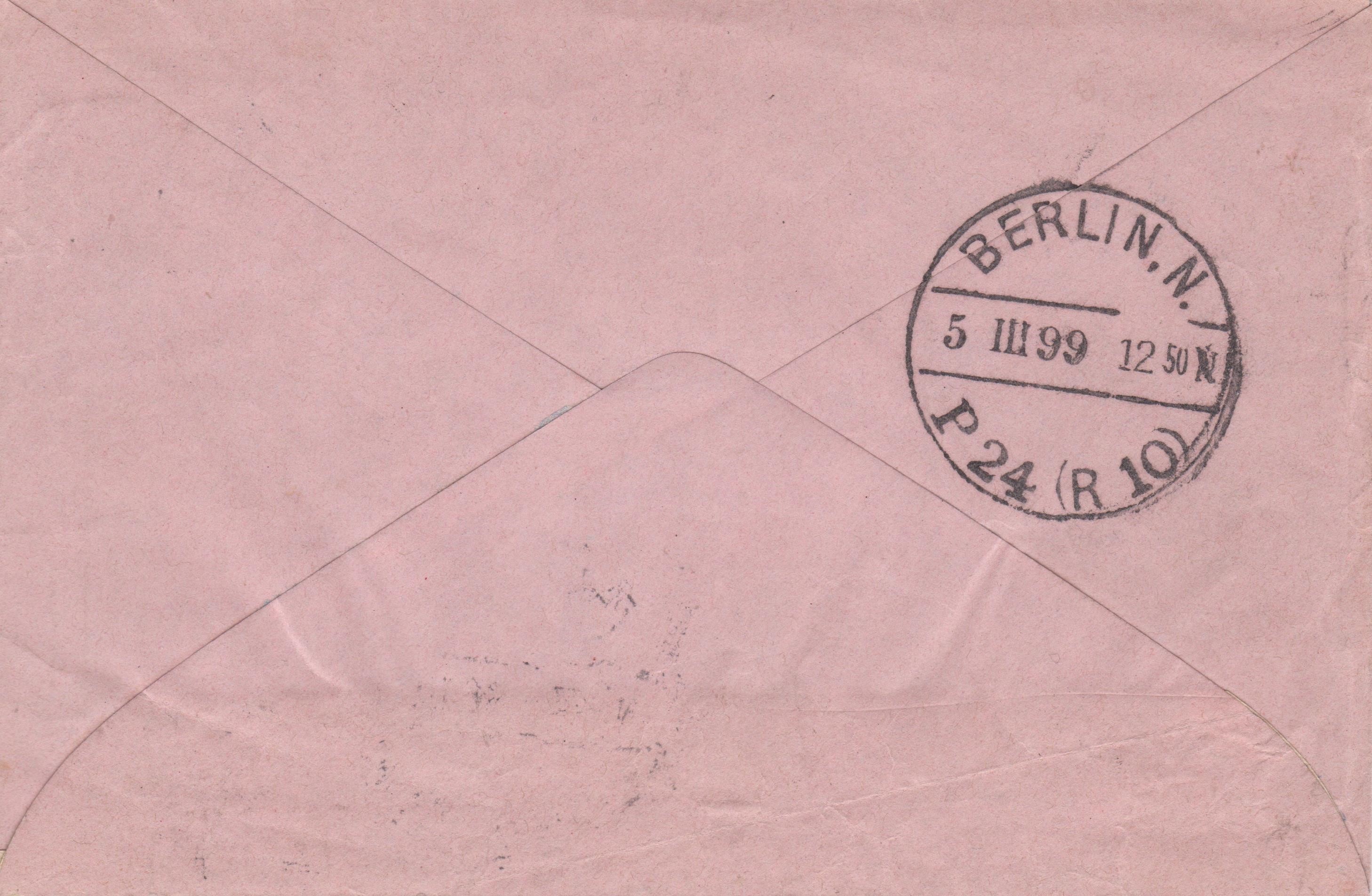 Rückseitig Ankunftstempel der Berliner Rohrpost "BERLIN, N. P 24 (R 10)":