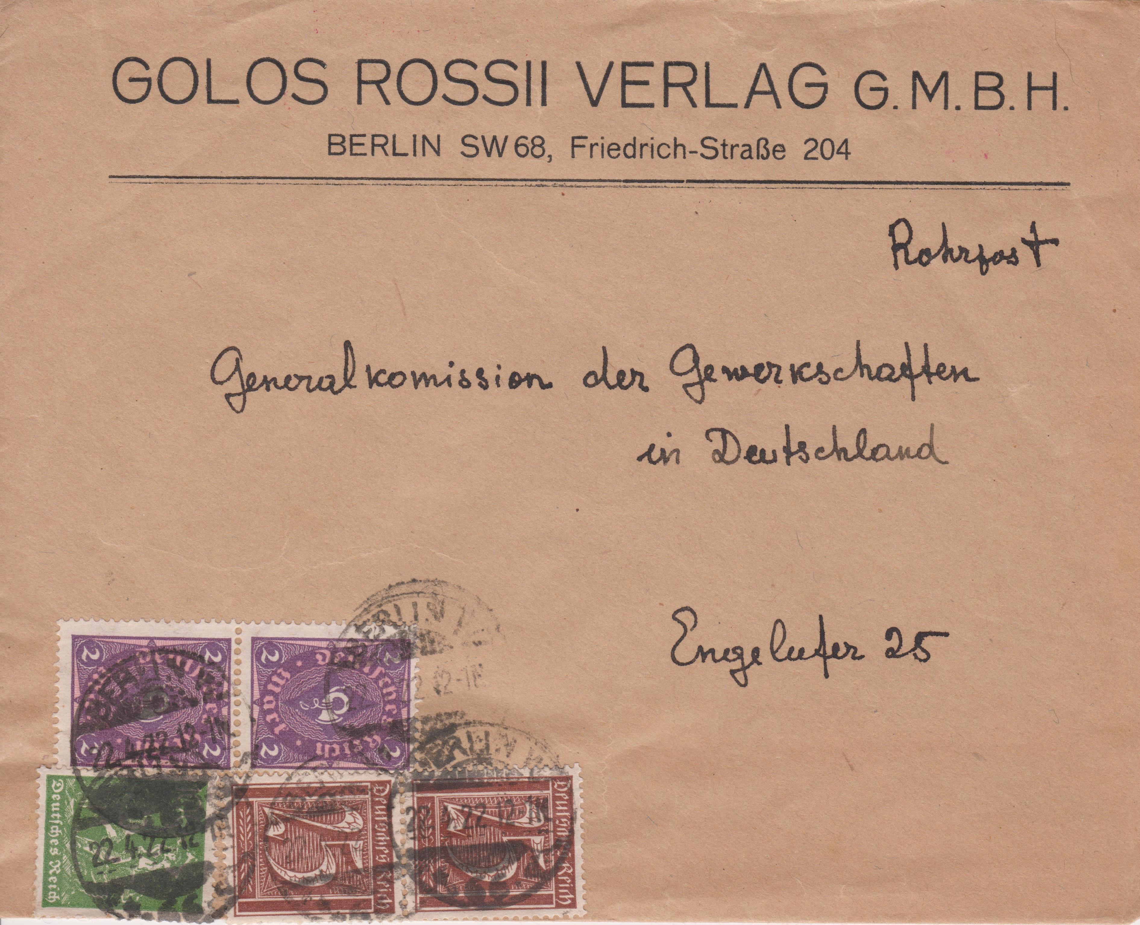 Brief im Ortsverkehr von Berlin, mit 550 Pf frankiert aufgegeben am 22.04.1922 in BERLIN W 66, adressiert "Rohrpost Engelufer 25":